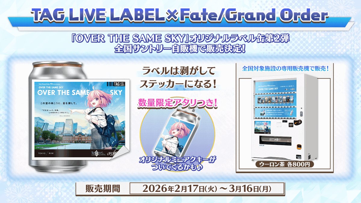 10周年記念「OVER THE SAME SKY」オリジナルラベル缶第2弾が2月17日より全48種が全国サントリー自販機で販売!あなたの地域にもサーヴァントたちがやってくる 2026年02月13日 カテゴリ:Fate/Grand Order 続きを読む
