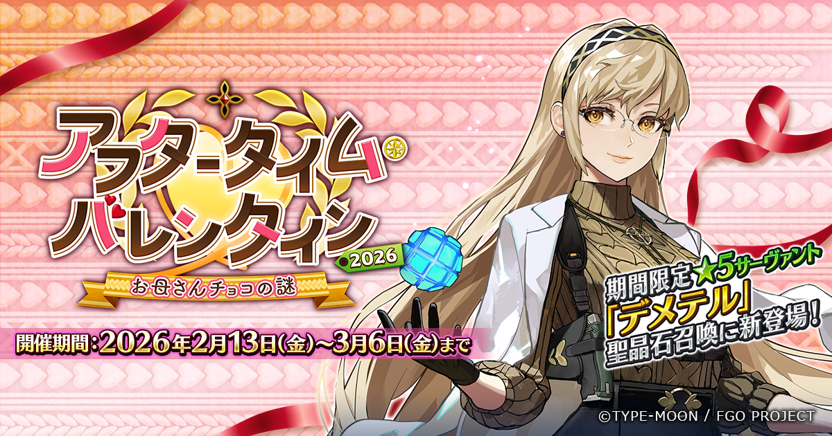 「アフタータイム・バレンタイン2026 ~お母さんチョコの謎~」が開幕!カルデア基地内に生じた微小聖杯回収のため、女神デメテルと共に最大最強のお母さんチョコを作り上げよう! 2026年02月13日 カテゴリ:FGOイベント 続きを読む