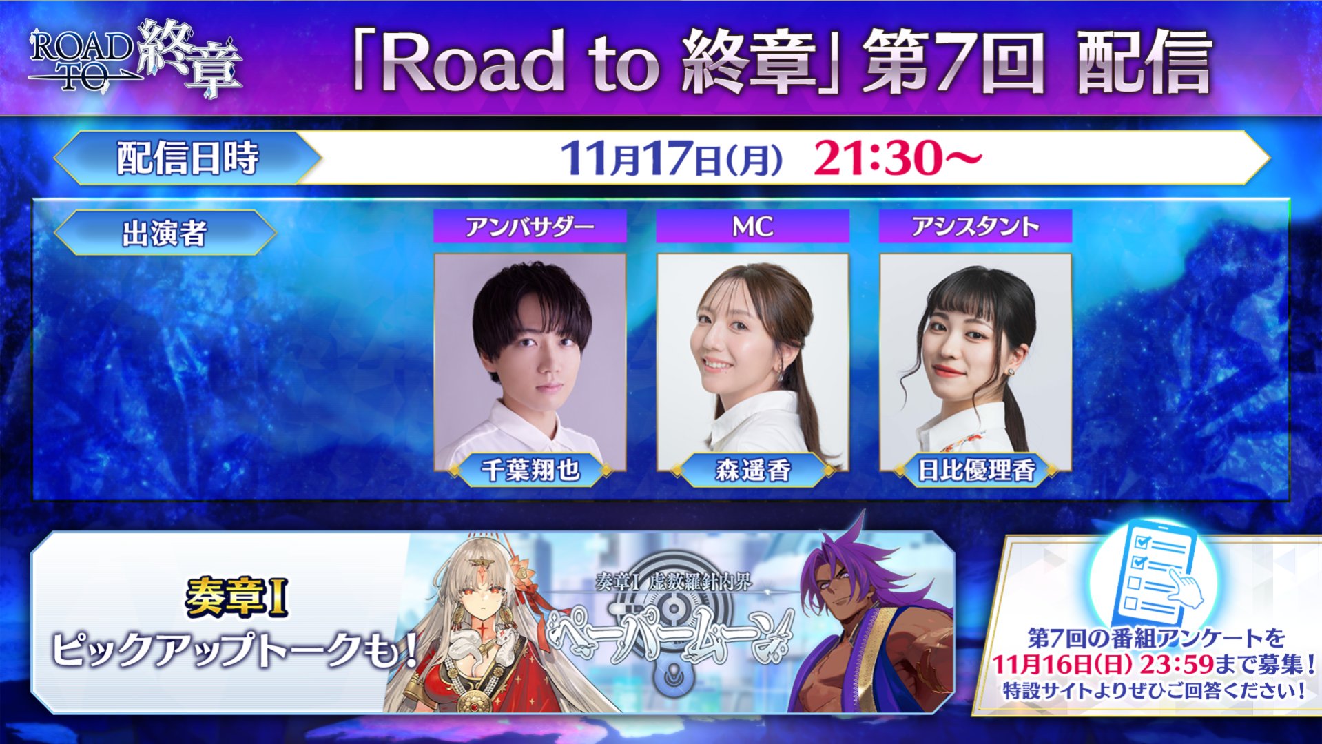 「Road to 終章」第7回配信が11月17日より配信。本日は千葉翔也さん、森遥香さん、日比優理香さんとでお届けいたします。 2025年11月17日 カテゴリ:Fate/Grand Order 続きを読む