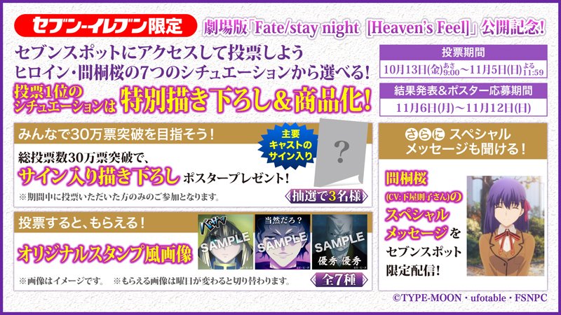 セブンイレブンにて劇場版Fate/stay night[HF]の間桐桜のシチュエーション投票受付中!1位になったシチュエーションは描き下ろし&商品化! 2017年10月19日 カテゴリ:Fate/stay night 続きを読む