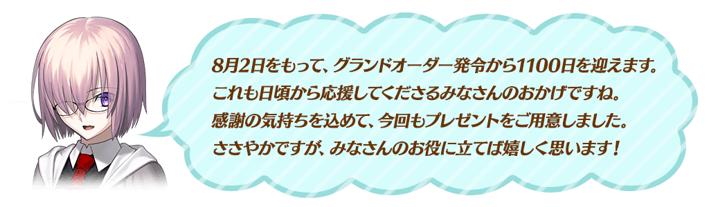 明日、8月2日(木)で「Fate/Grand Order」はリリース1100日を迎えます!8月2日(木)限定のログインボーナスがございますので、ログインをお忘れなく。詳しくは→https://t.co/b90Spm8yIW #FGO #FGO3周年 pic.twitter.com/1yvwGjDYJ7