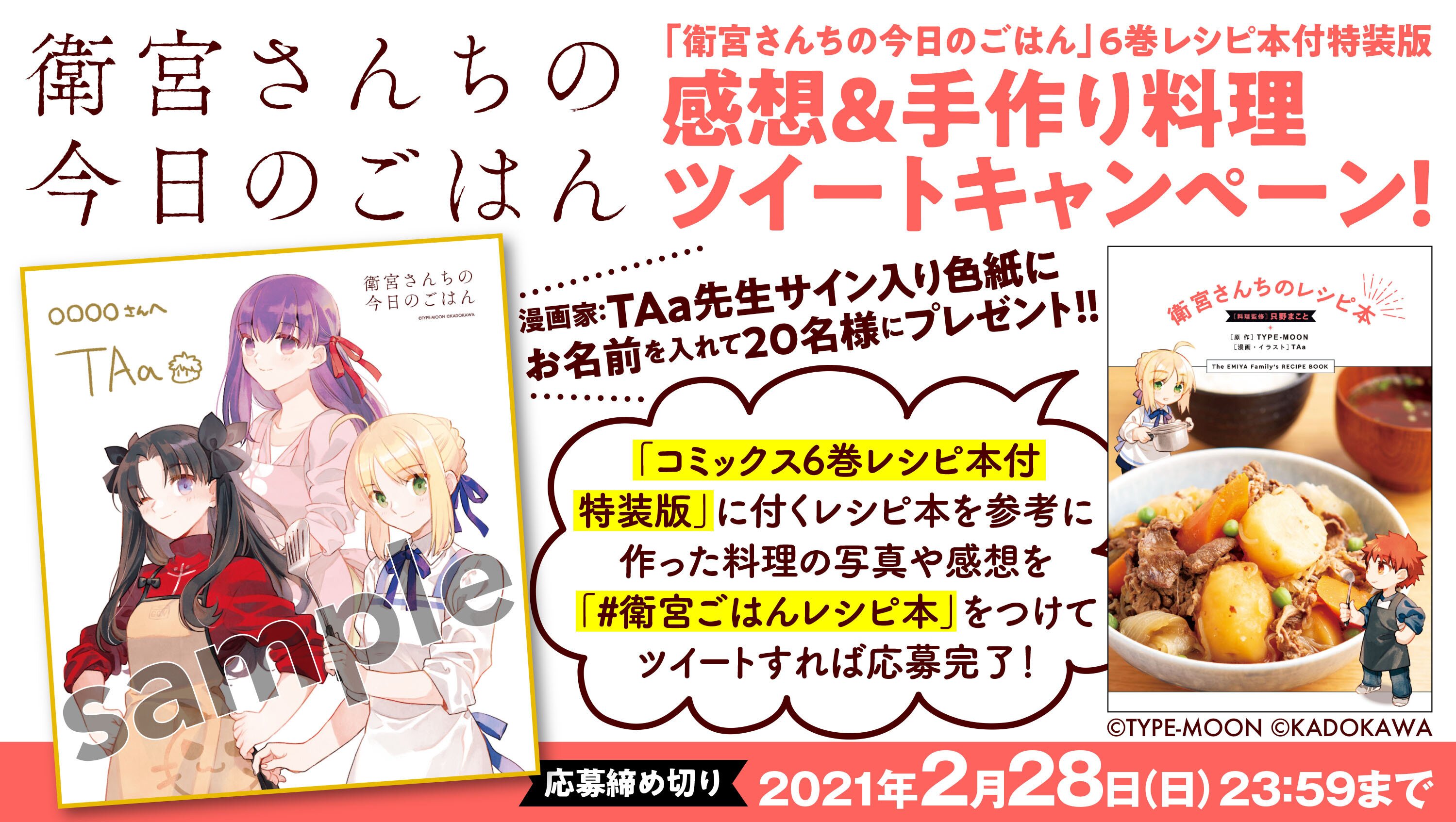 祝「衛宮さんちの今日のごはん」6巻レシピ本付き特装版発売。抽選でTAaさんのサイン色紙が当たる「感想&手作り料理ツイートキャンペーン」を実施いたします。