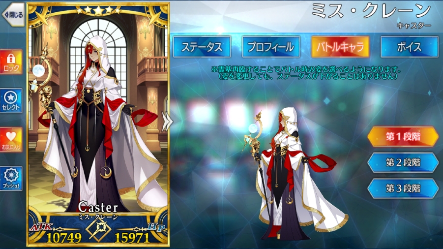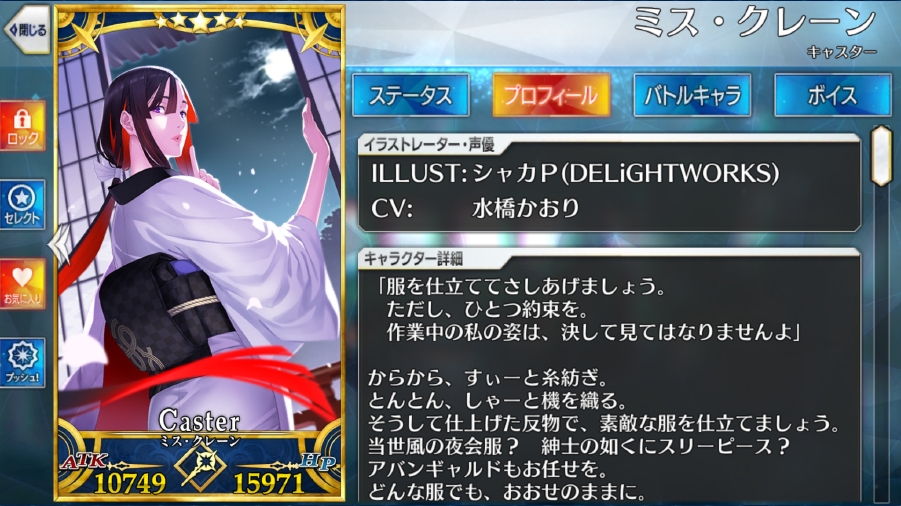 いや実際クレーンの見てくれも表面もお淑やかといえばそうなんですが、中身が見た目とのギャップに誰もがドン引くレベルのオタク思考。言うなればメディアと黒ヒゲを足して2で割ったみたいなそんな性格ですね。マイルームで見せるハァハァ顔はボイス含め是非一度御覧あれ。…引くなよ?