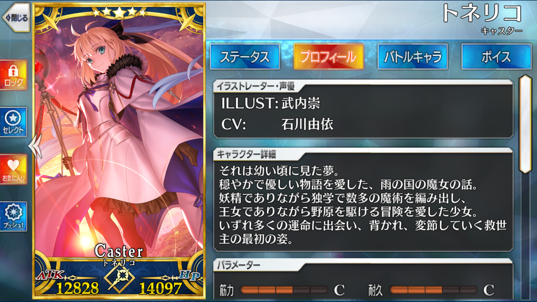 | 地、秩序、善(第1段階) 、中庸(第2段階)、夏(第3段階)、女 サーヴァント、人型、妖精、アルトリア顔、王(第3段階)、夏モード(第3段階) | ||||||||||||