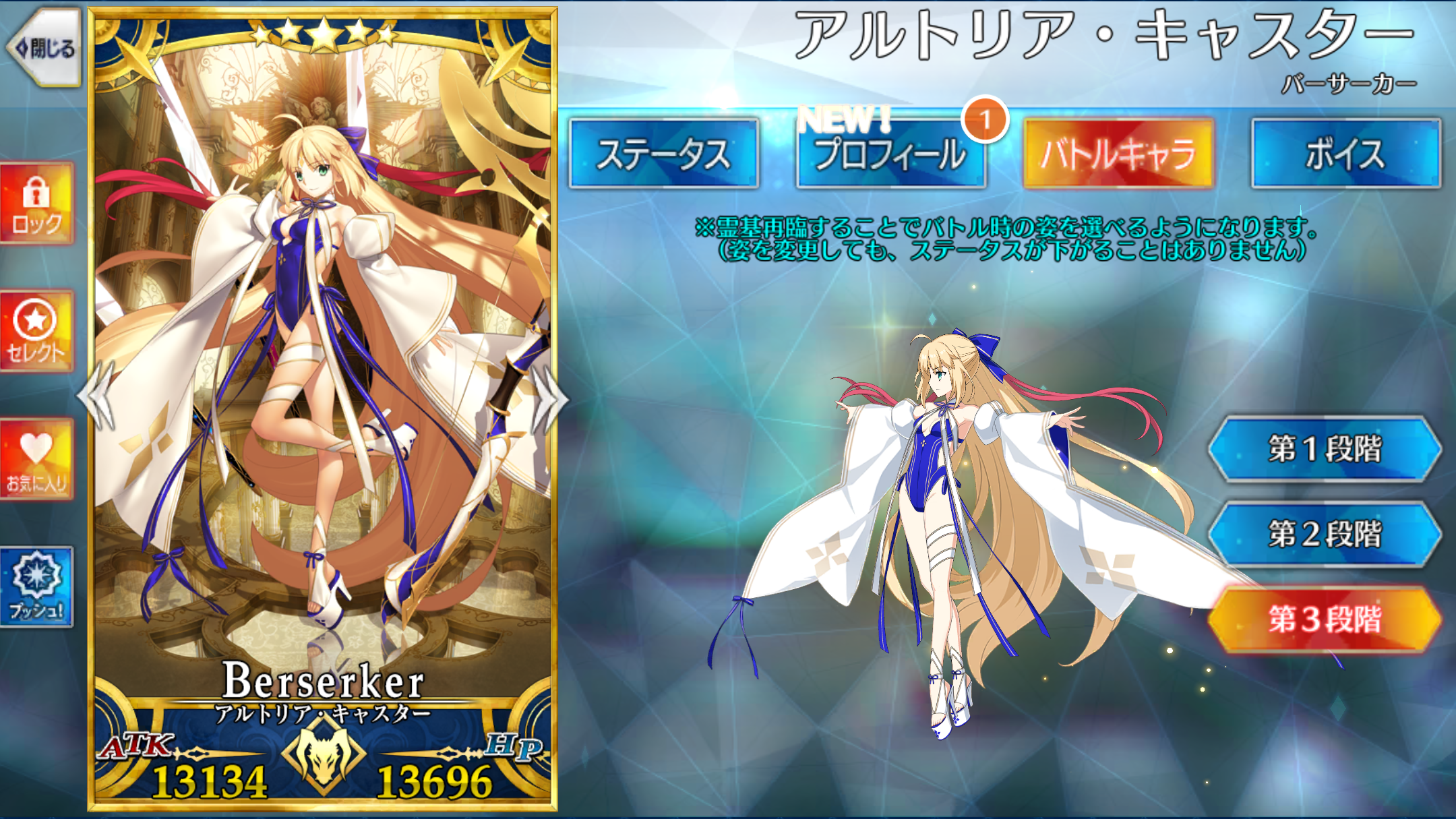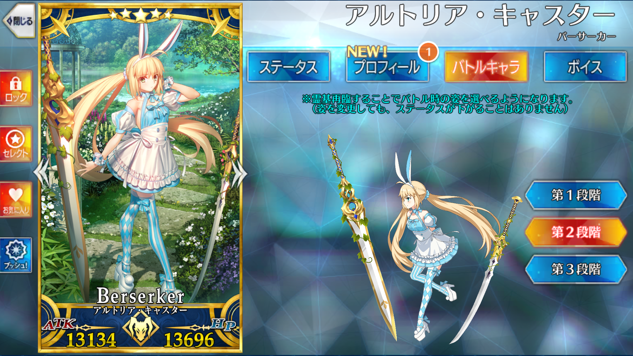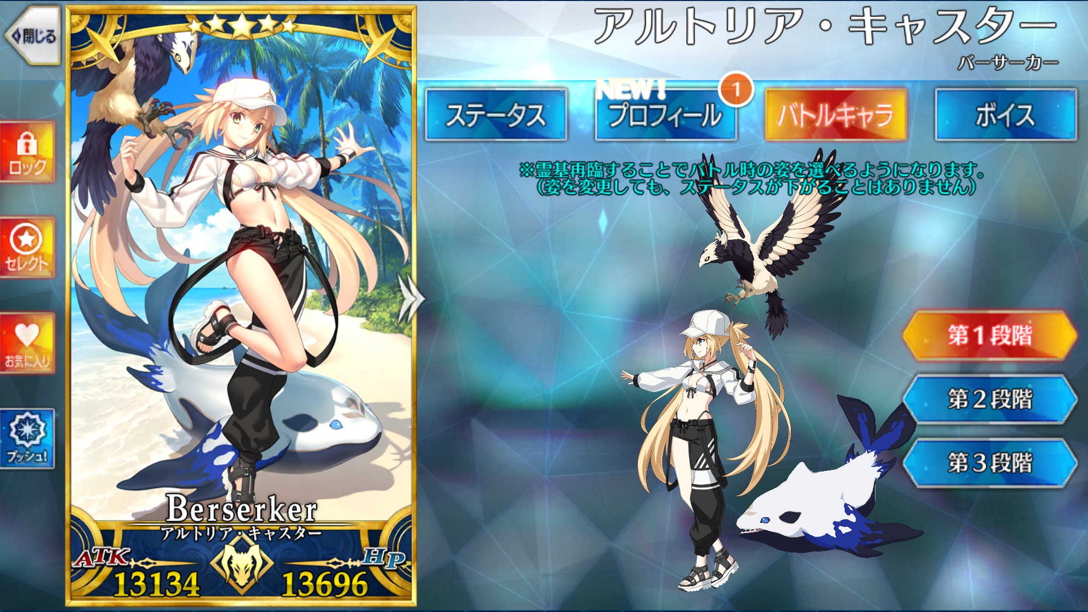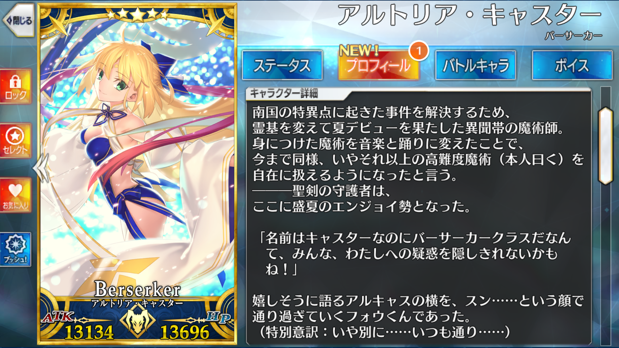 | 星、中立、善、女 サーヴァント、人型、妖精、アルトリア顔、アーサー、円卓の騎士、夏モード / 浮遊(第三段階) | ||||||||||||