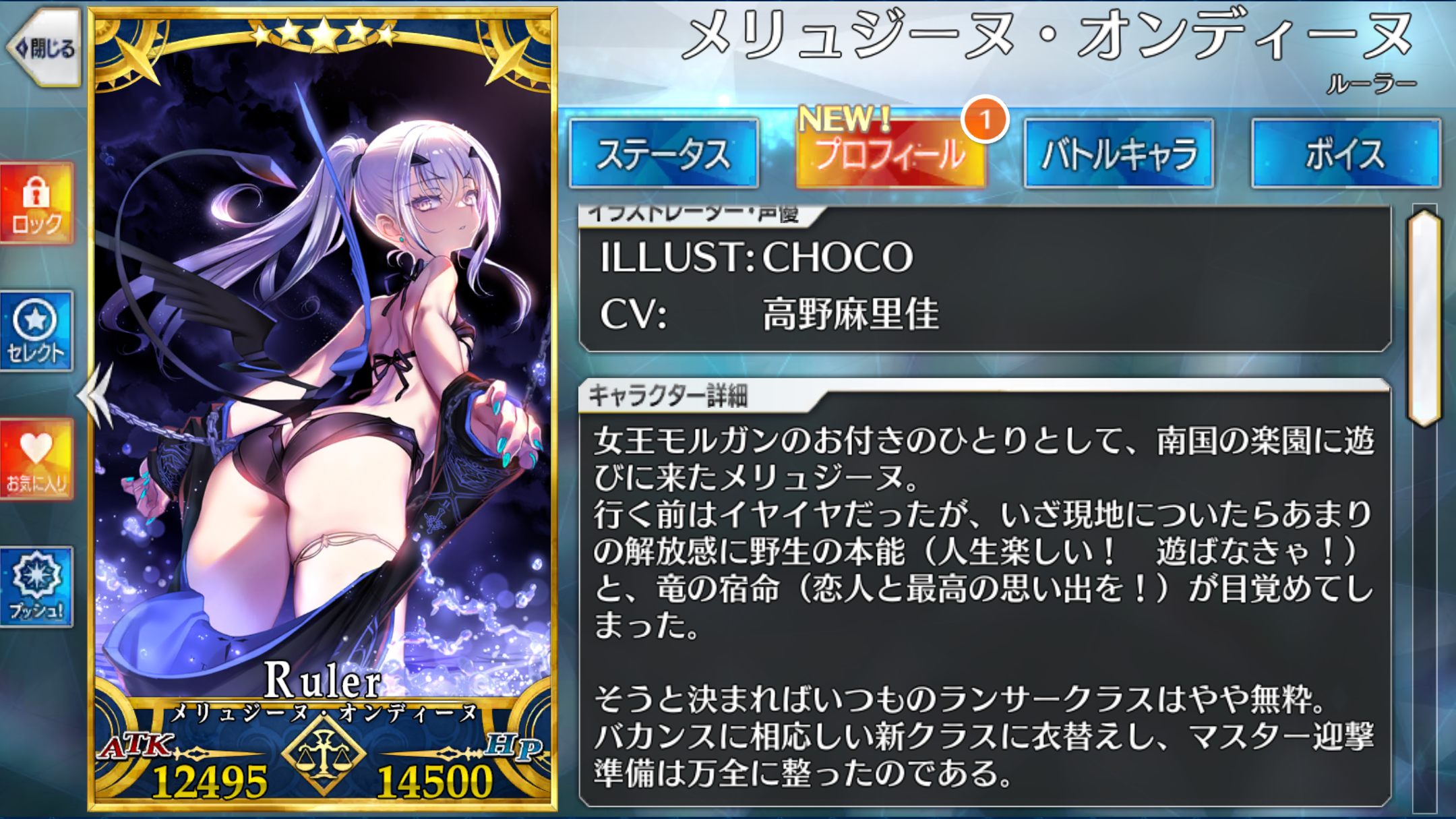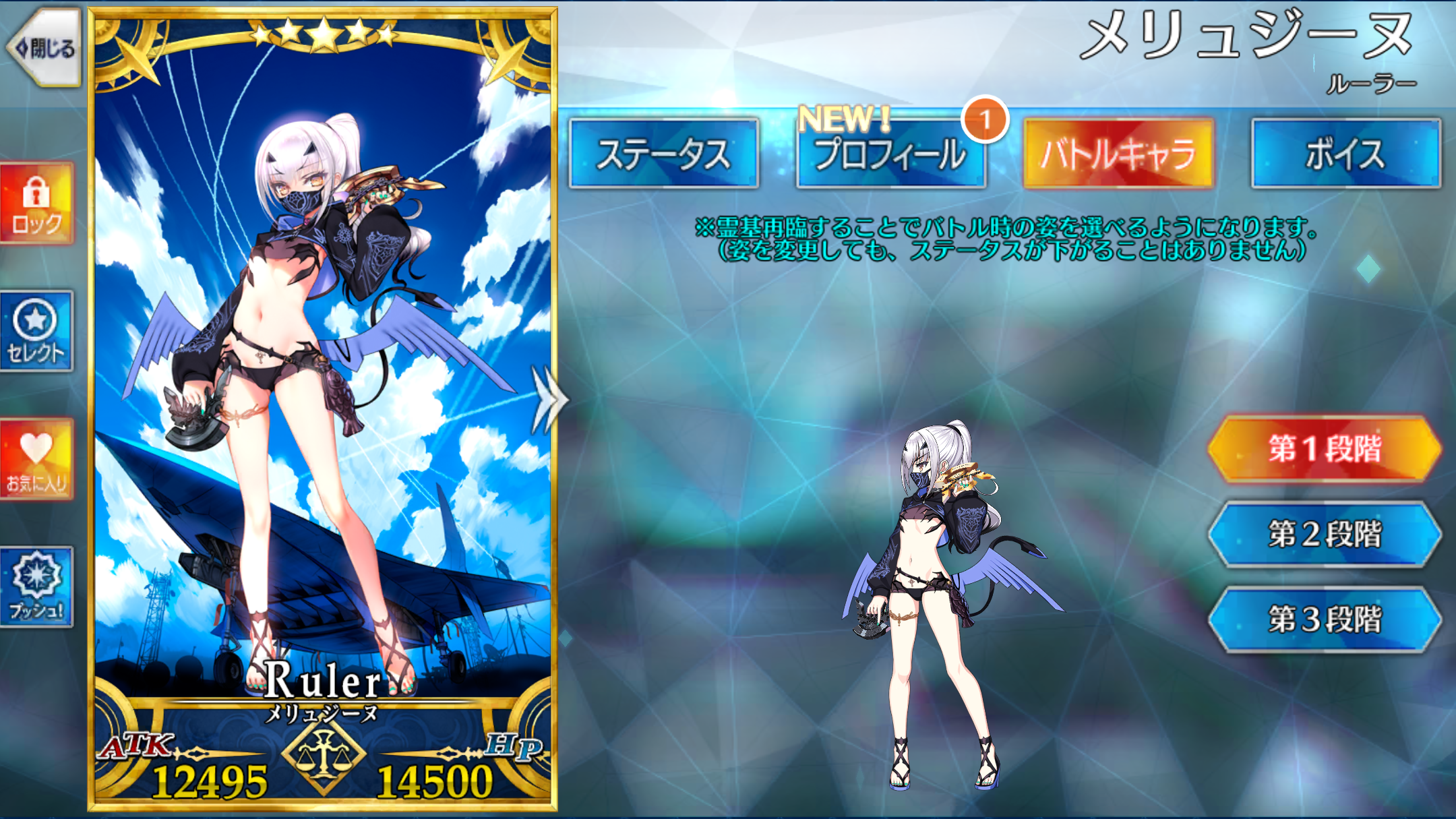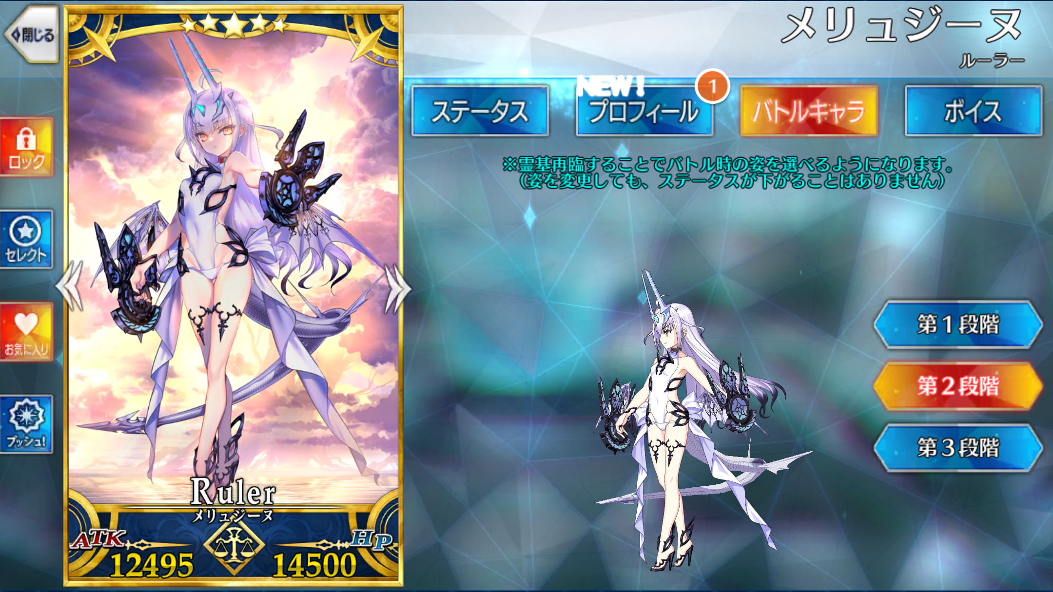 | 地、中立、悪、女 サーヴァント、人型、エヌマ特攻無効、妖精、竜、騎乗スキル、愛する者、魔獣型、童話、ケモノ科、夏モード、浮遊(第3段階) | ||||||||||||