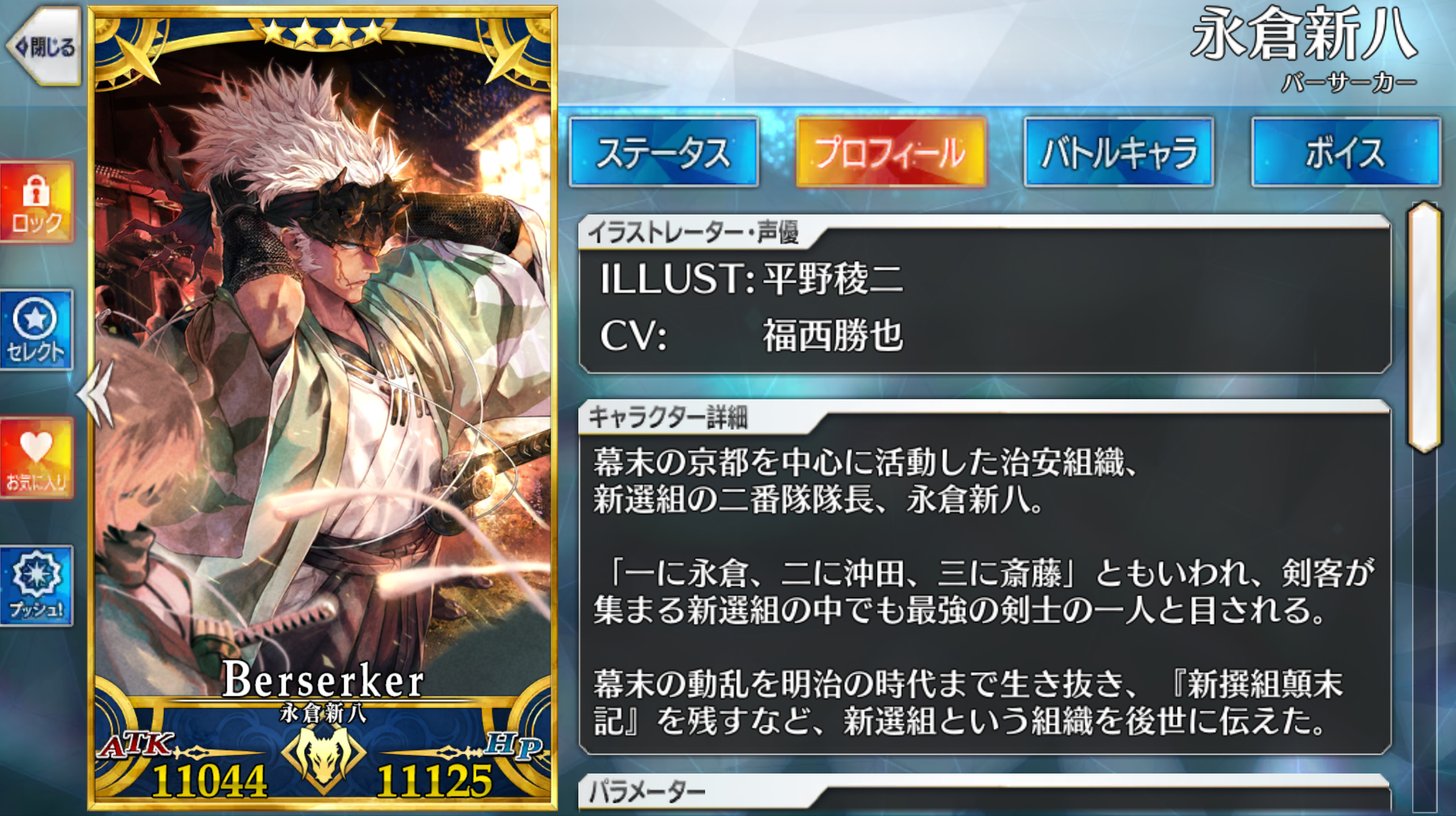 | 人、中立、善、男 サーヴァント、人型 、ヒト科、新撰組 | ||||||||||||