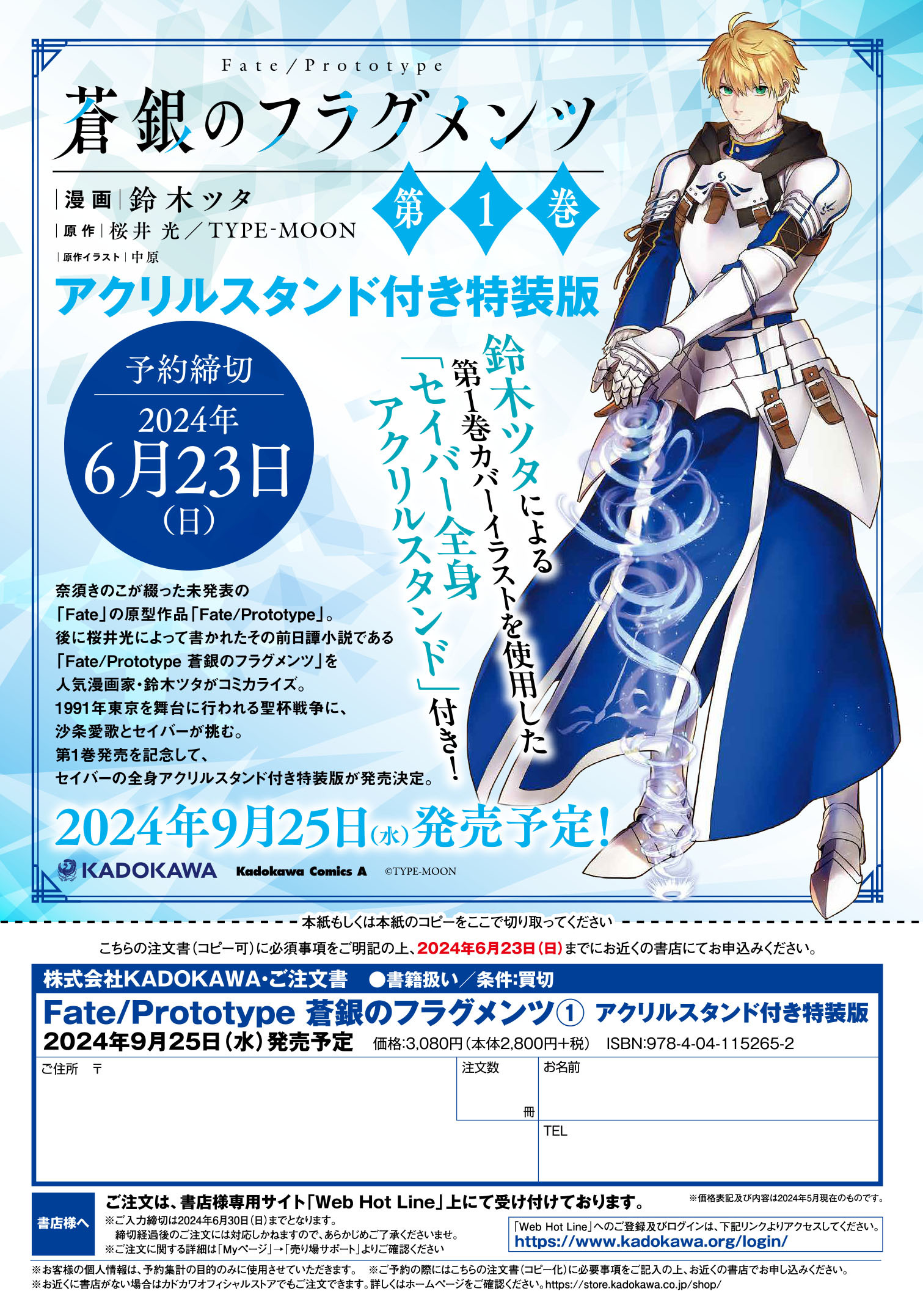 漫画担当、鈴木ツタ先生による「セイバー」アクリルスタンドが付いた特装版も同時に発売です