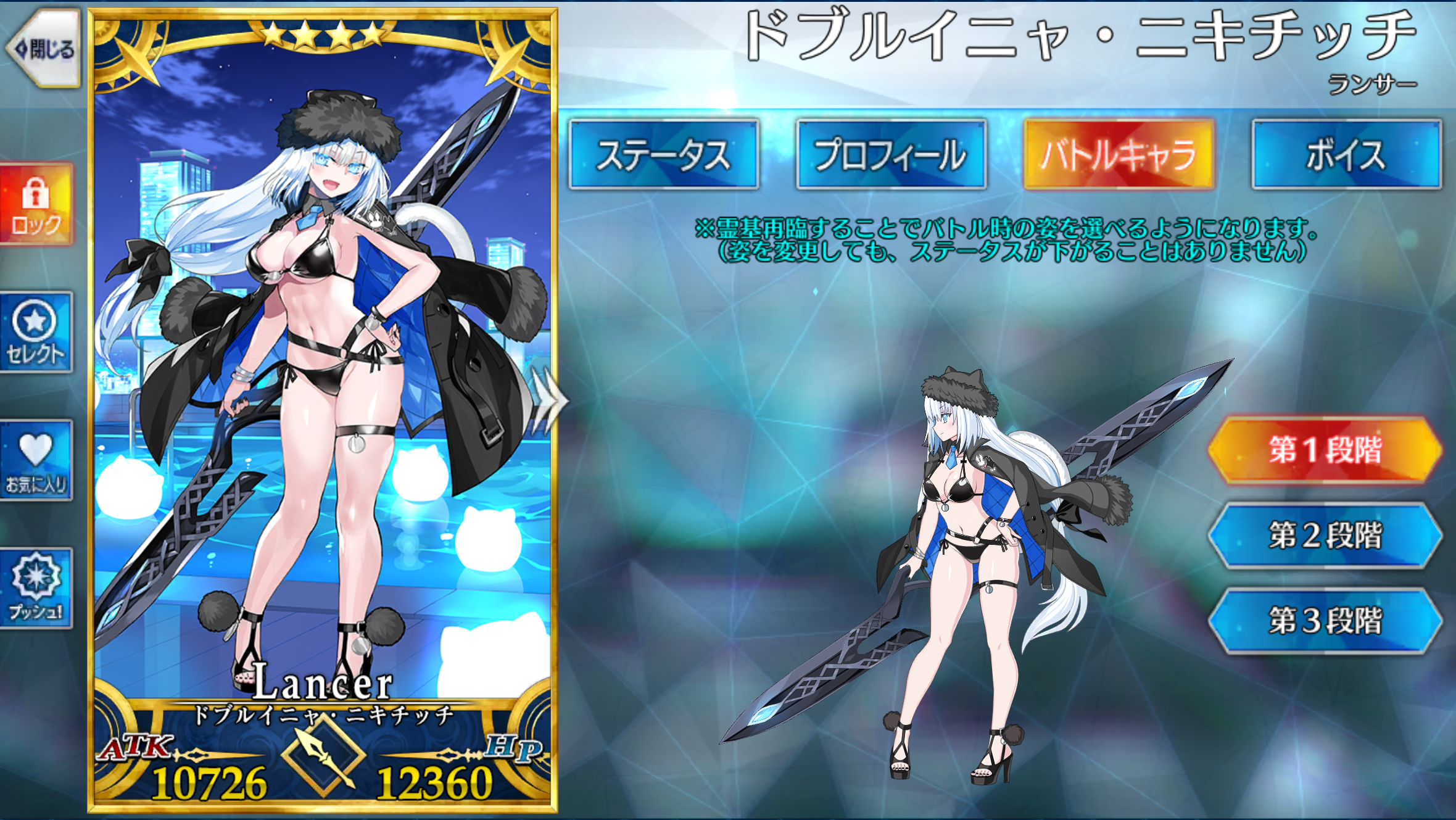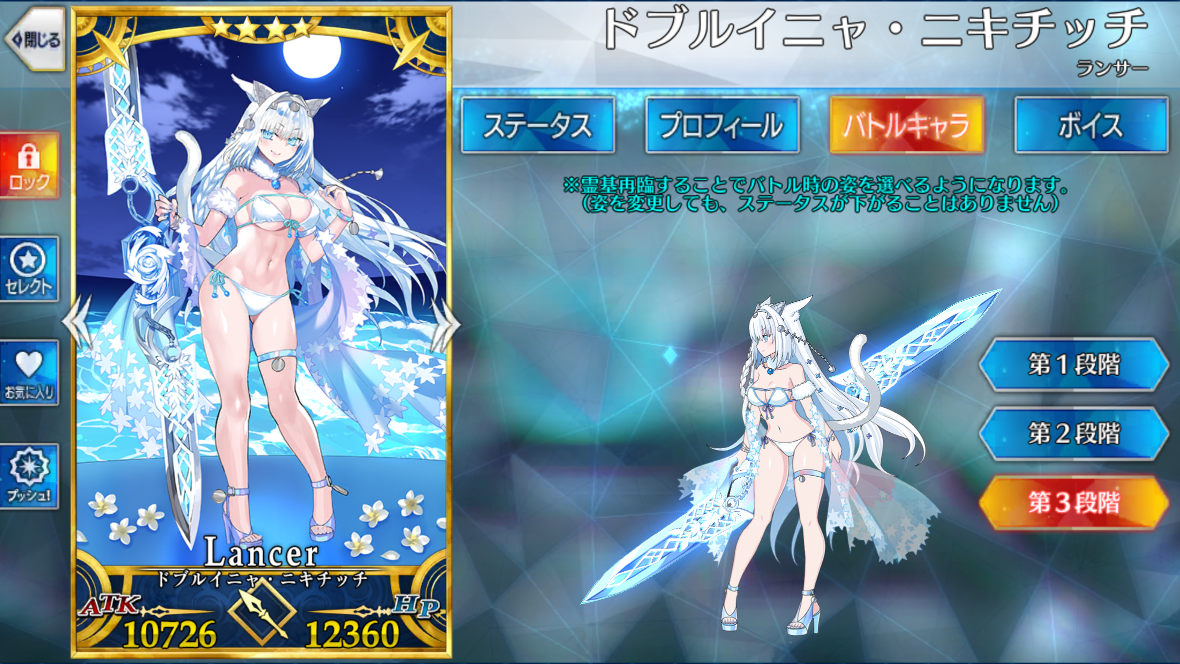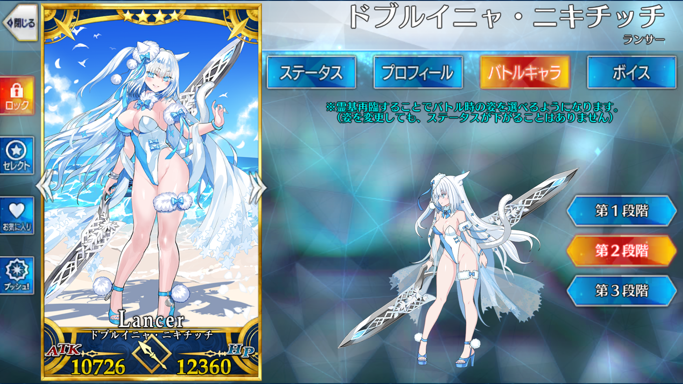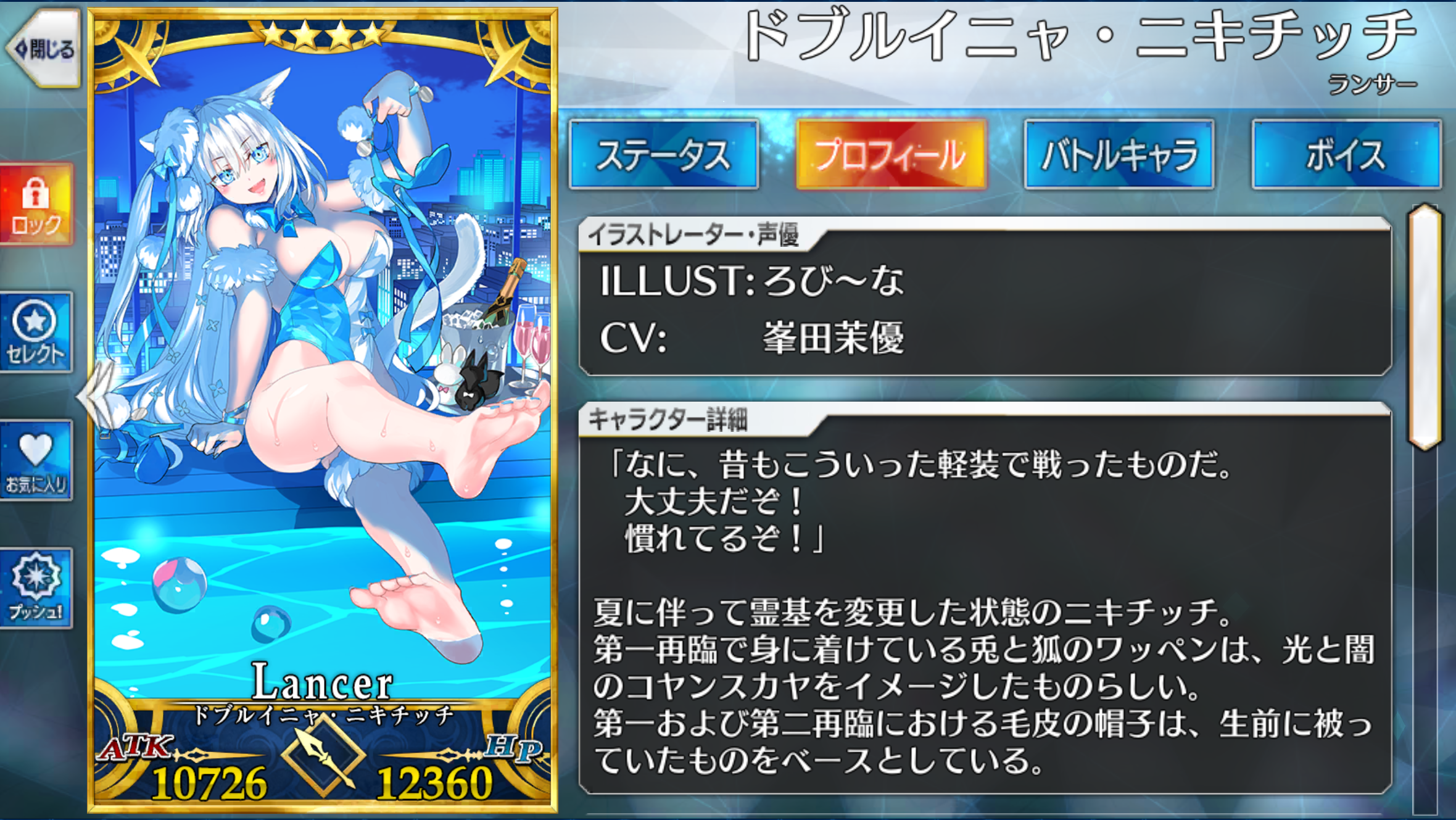 | 地、中立、善、女 サーヴァント、人型、騎乗、猛獣、愛する者、魔獣型、ケモノ科、夏モード | ||||||||||||