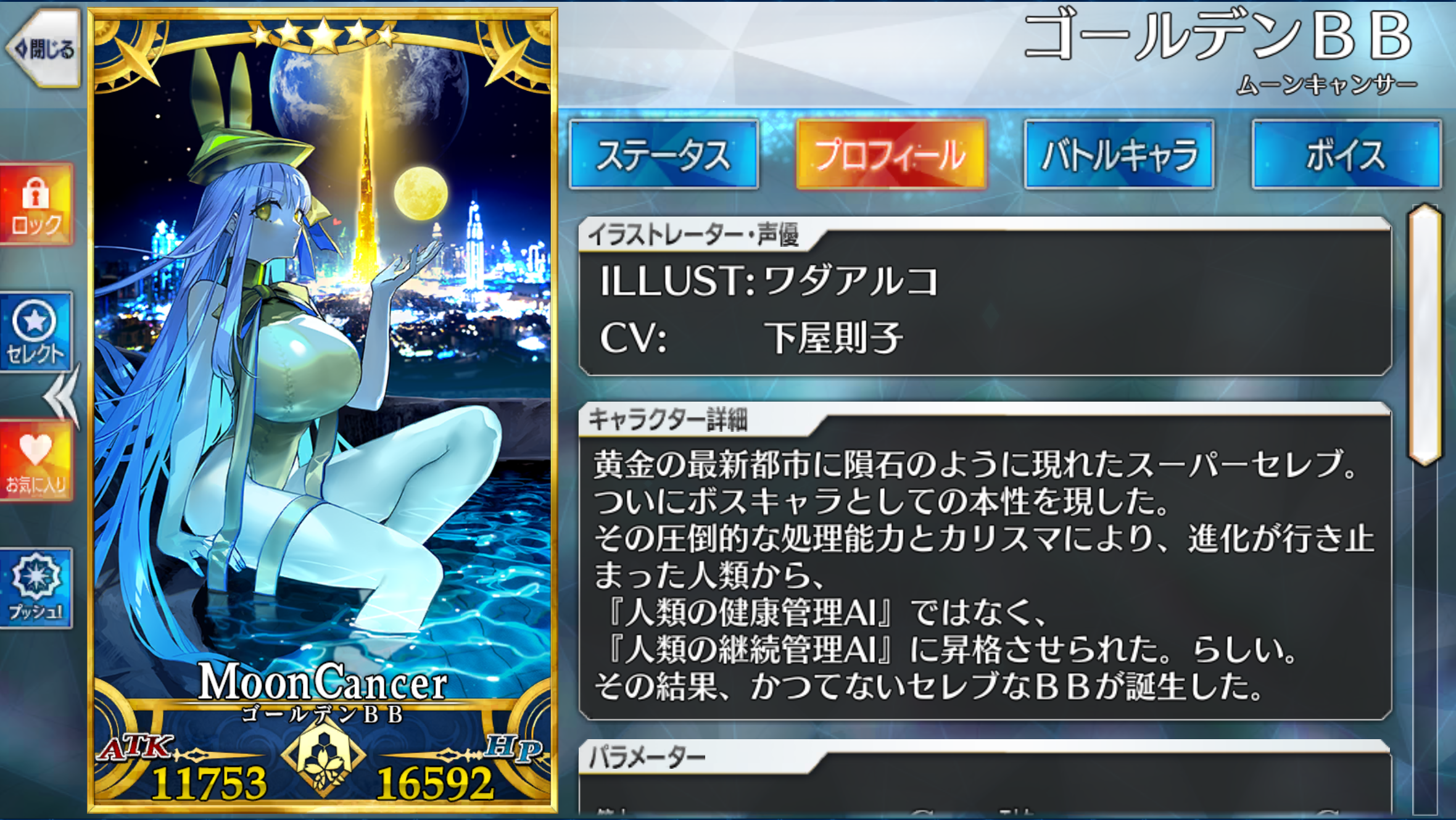 | 星、混沌、善、女 サーヴァント、人型、エヌマ特攻無効、神性、超巨大、ヒト科、機械、豚化無効、夏モード、神域相殺、浮遊(第2段階) | ||||||||||||