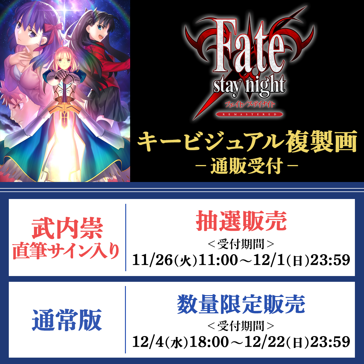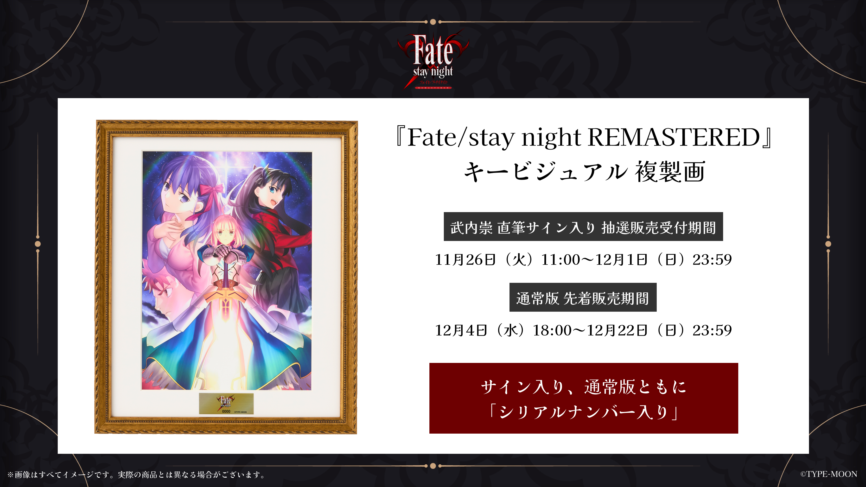 『Fate/stay night REMASTERED』のキービジュアルを高精彩印刷の複製画(プリモアート)にしました。 シリアルナンバーも印字された豪華仕様になります。