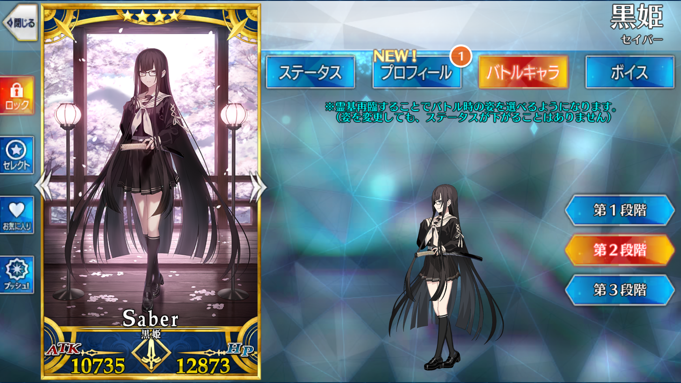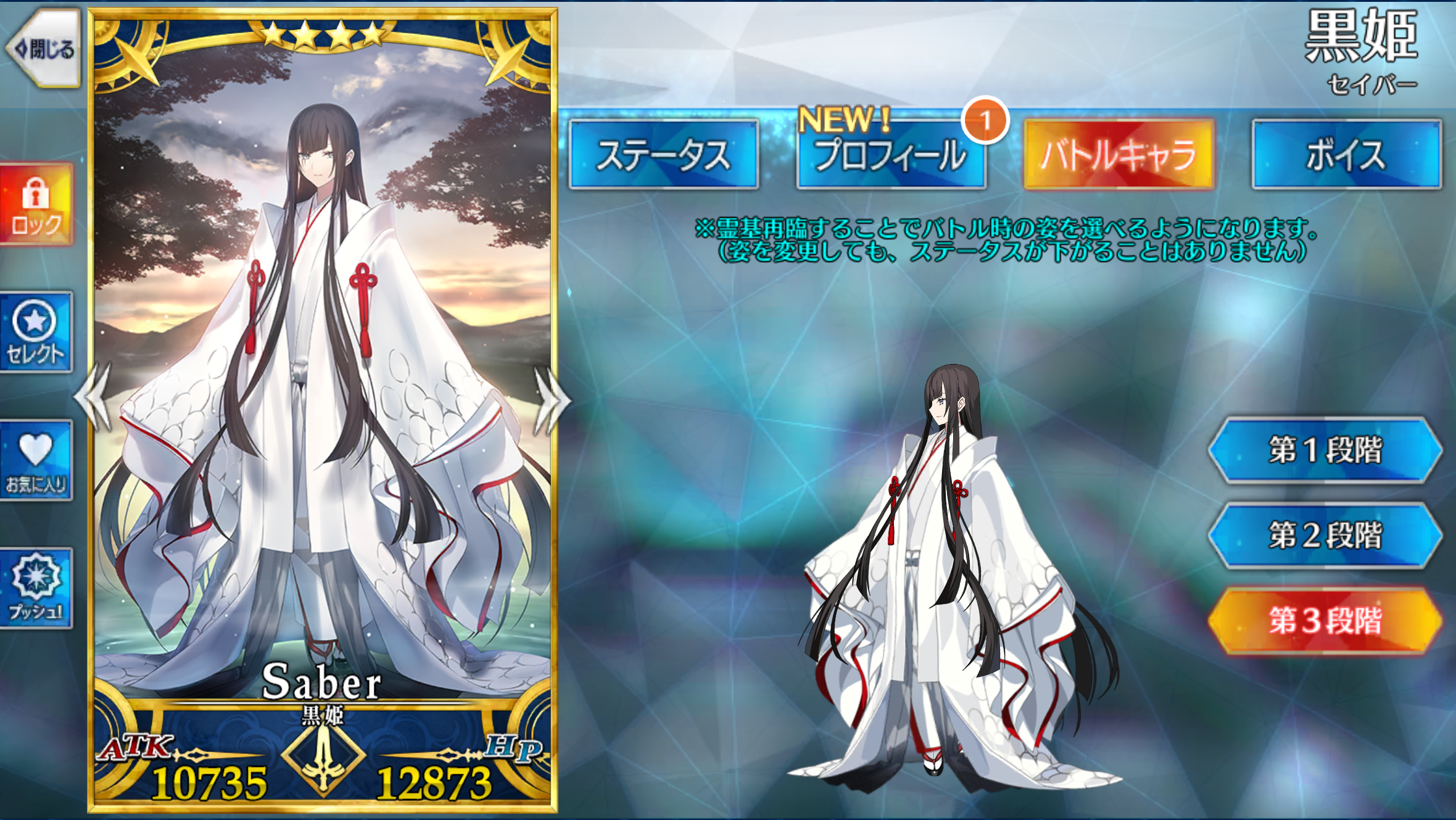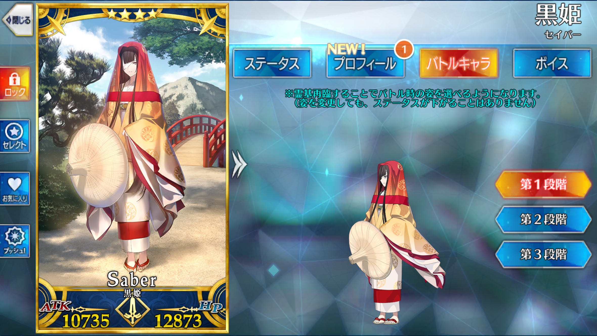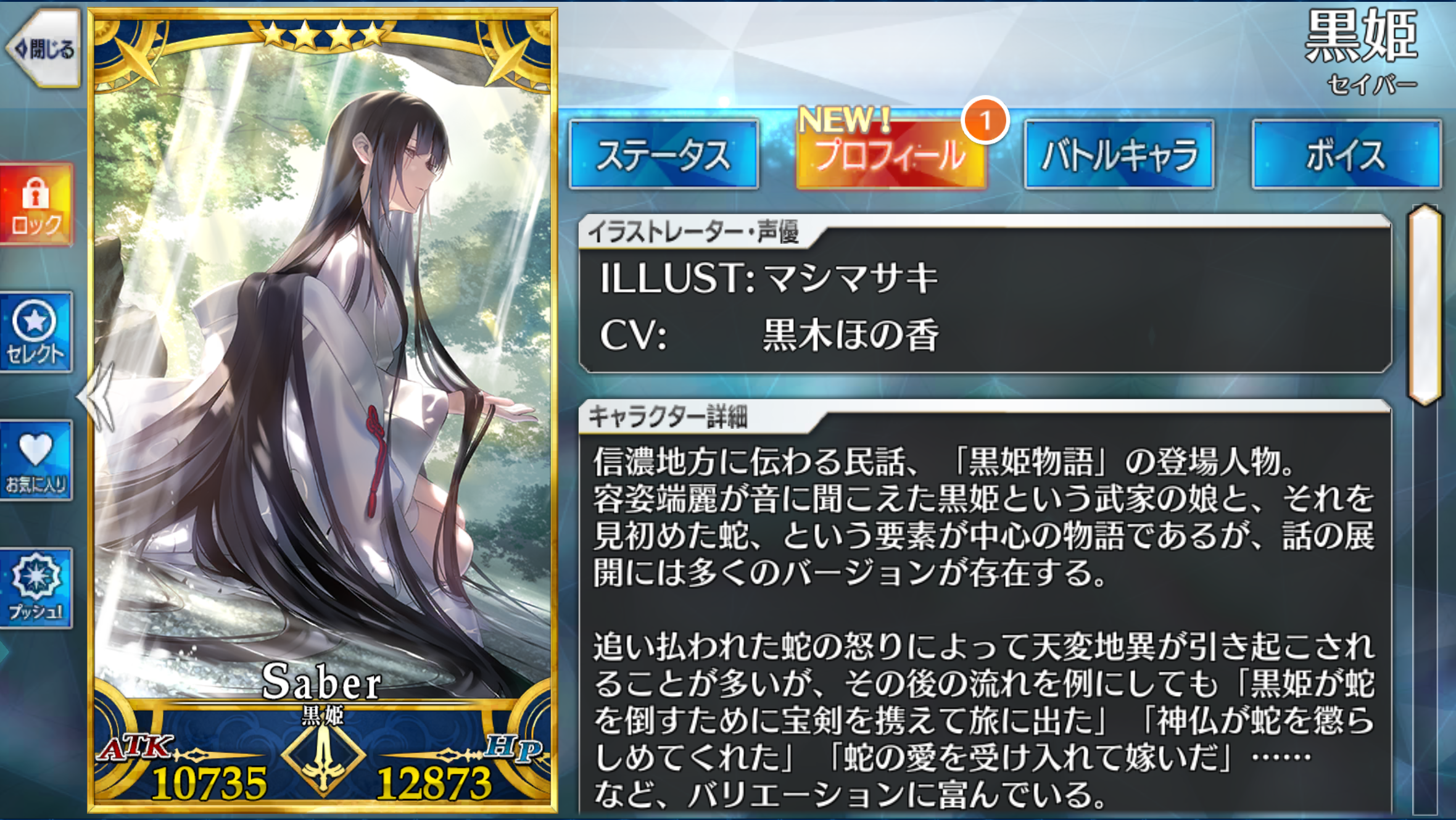 | 地、秩序、善、女 サーヴァント、人型、騎乗、セイバークラス、ヒト科 | ||||||||||||