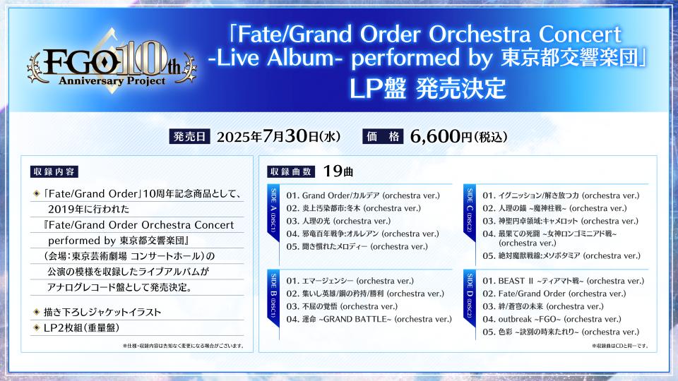 【LP盤発売決定】#FGO 10周年記念商品として、2019年に行われた『Fate/Grand Order Orchestra Concert performed by 東京都交響楽団』の公演模様を収録したライブアルバムがアナログレコード盤として発売決定!