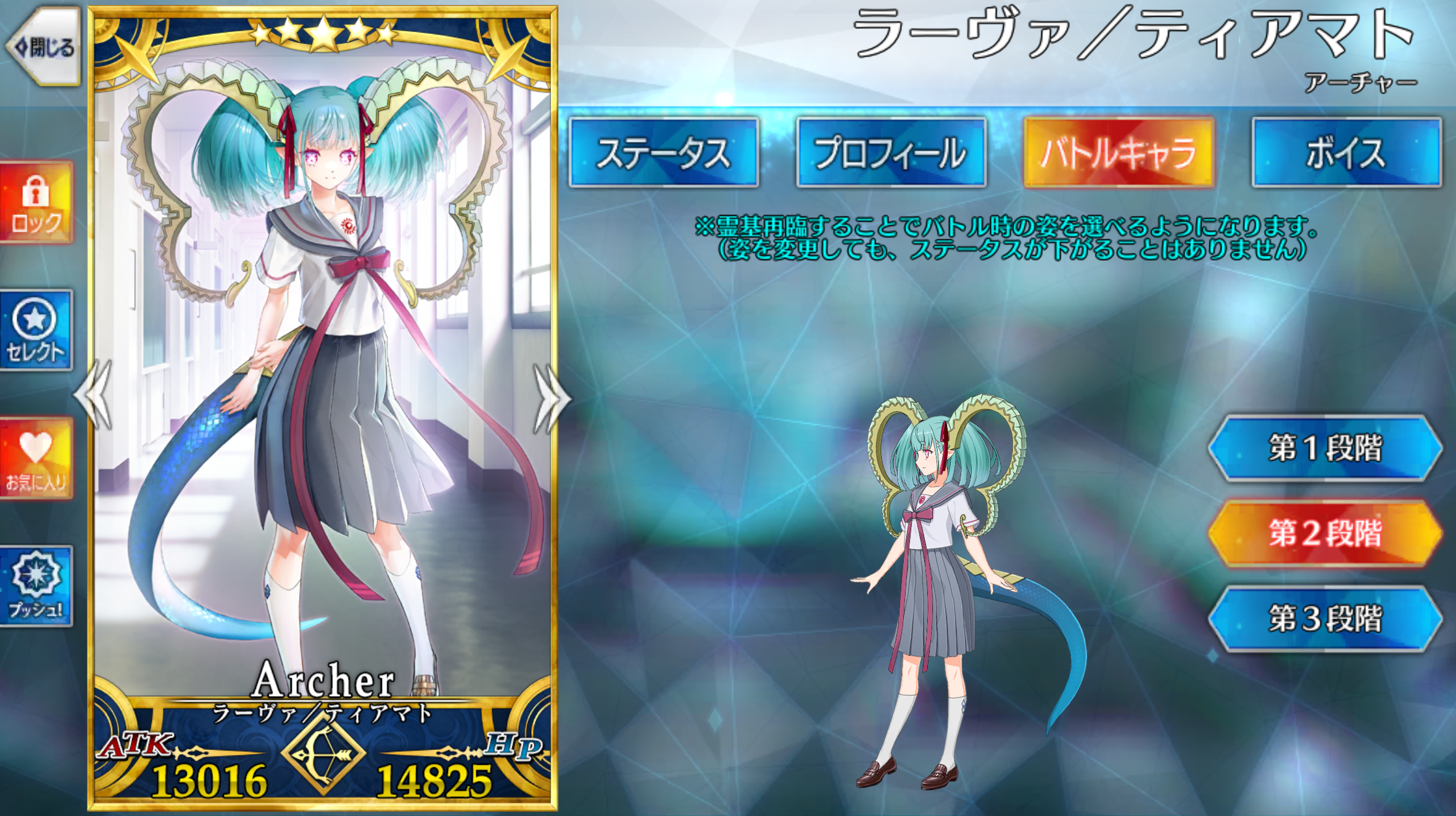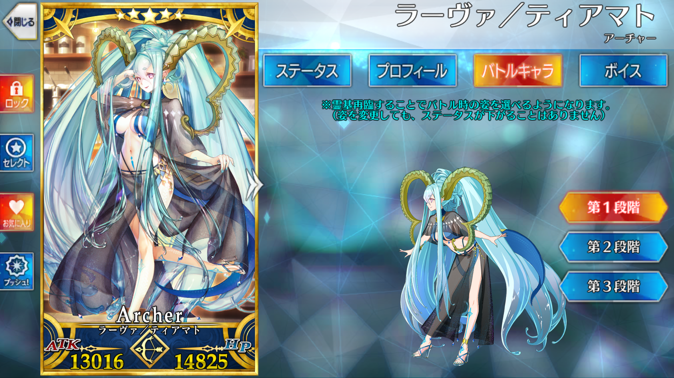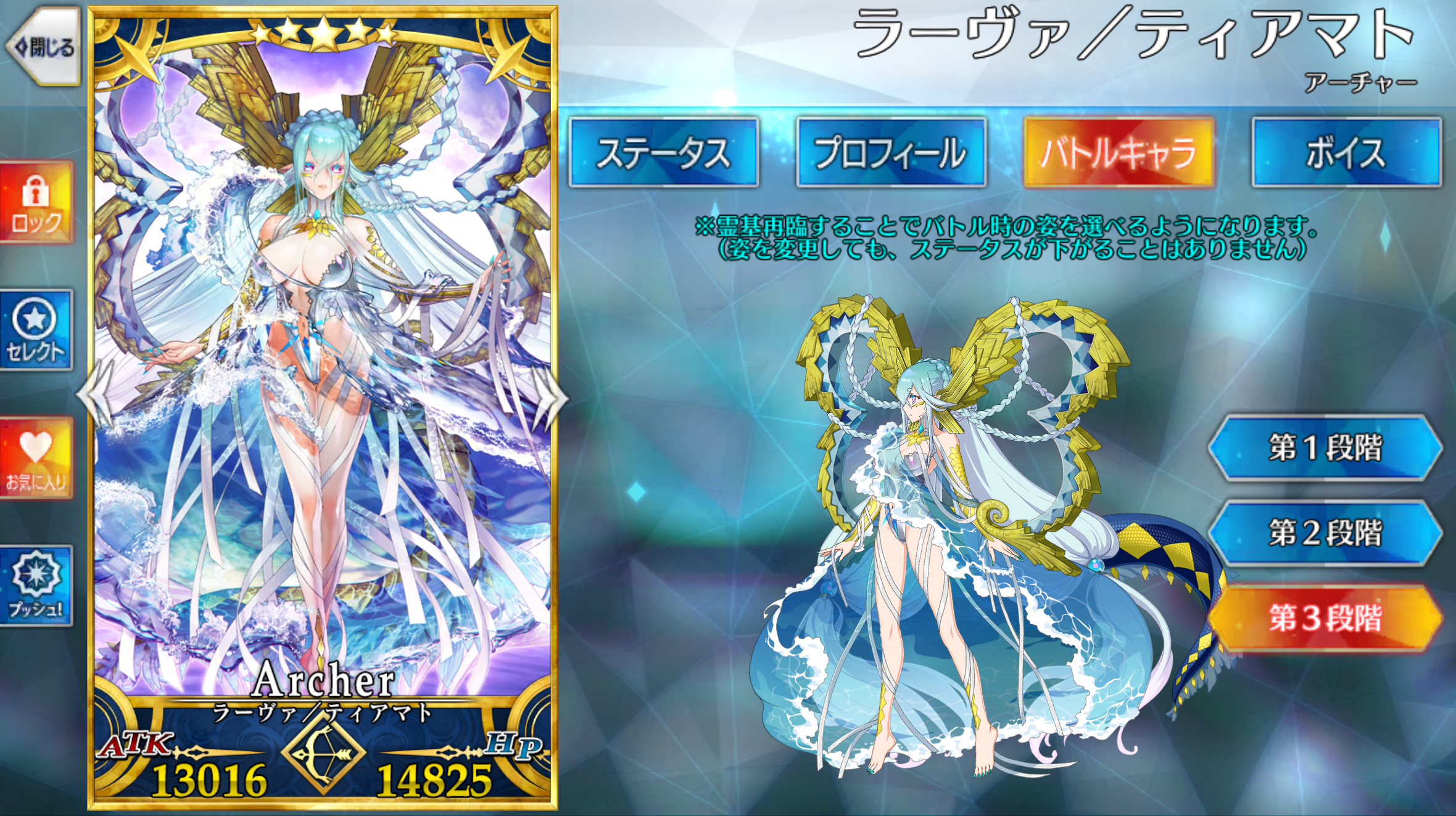 | 星、混沌、夏、女 サーヴァント / エヌマ特攻無効 / 神性 / 竜 / 超巨大 / 魔獣型 / 神霊 / ケモノ科 / 豚化無効 / 夏モード / 堰き止めるもの / 神域相殺 / 浮遊している(第3段階) | ||||||||||||