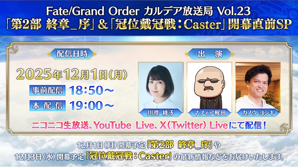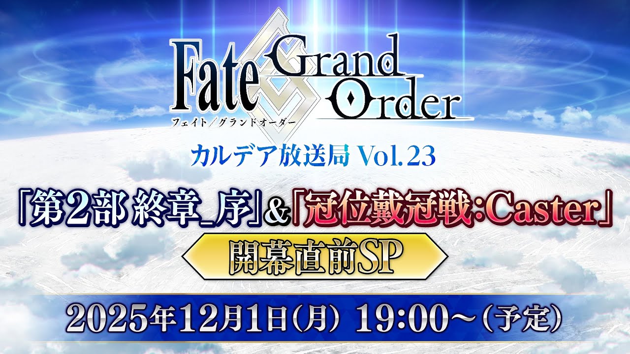 12月1日(月)19:00から『FGO カルデア放送局 Vol.23「第2部 終章_序」&「冠位戴冠戦:Caster」開幕直前SP』を配信!