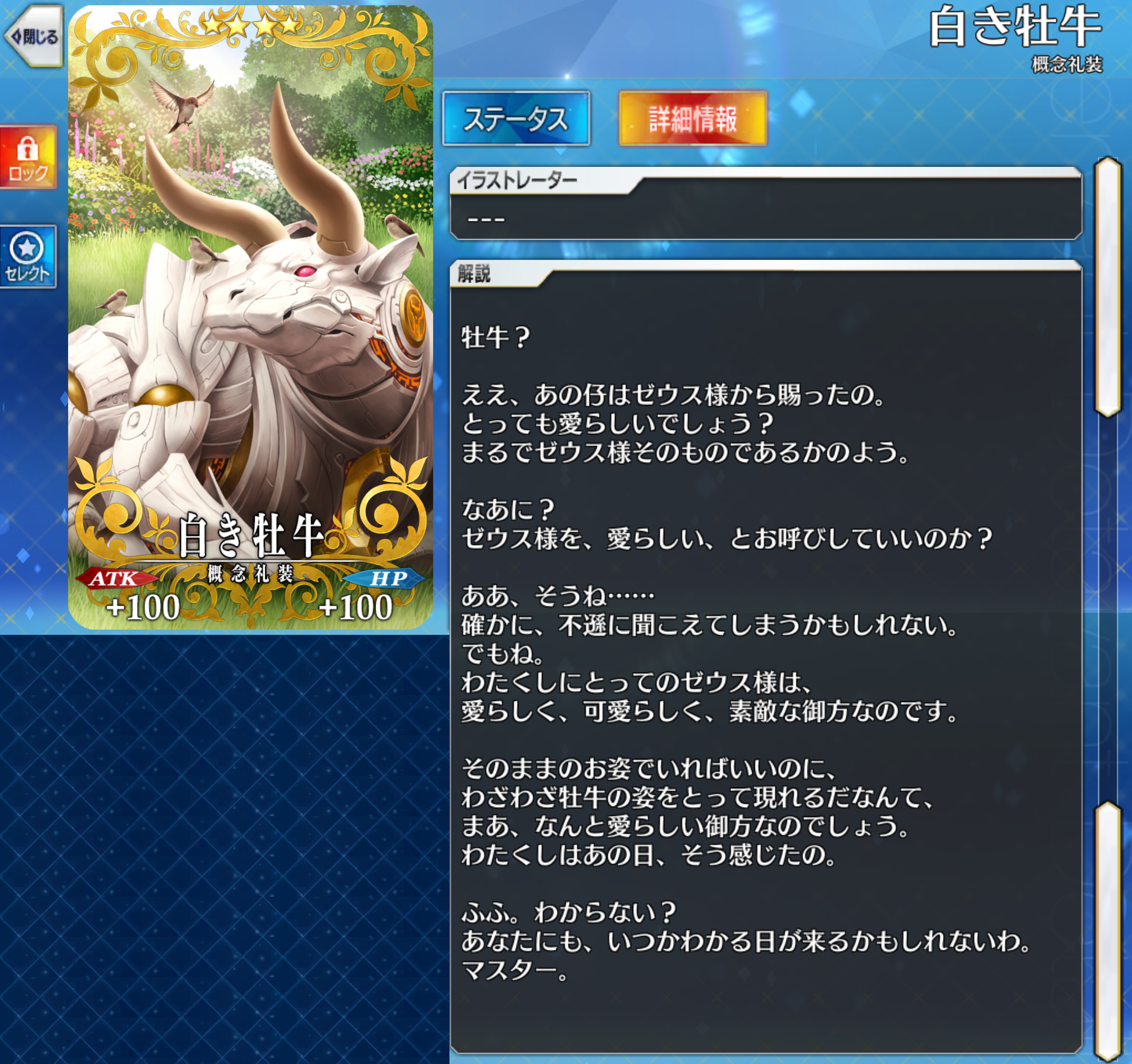 『エウロペ』の絆礼装を紹介。牡牛? ええ、あの仔はゼウス様から賜ったの。 とっても愛らしいでしょう? 2026年01月07日 カテゴリ:絆礼装 はいはいご馳走様でしたゼウスが牡牛の姿でエウロペを誘惑したって話。その後牡牛を本当にくれたみたいだが…そんな二人だけの恋の思い出を他人が共有できるか!ただ唯一気になるのはいつかこの牛からゼウスが出てきたりしないだろうなってことなんだよなぁ… コメントする コメントフォーム 名前 コメント 記事の評価 リセット リセット 顔 星 情報を記憶 コメントを投稿する 「絆礼装」カテゴリの最新記事