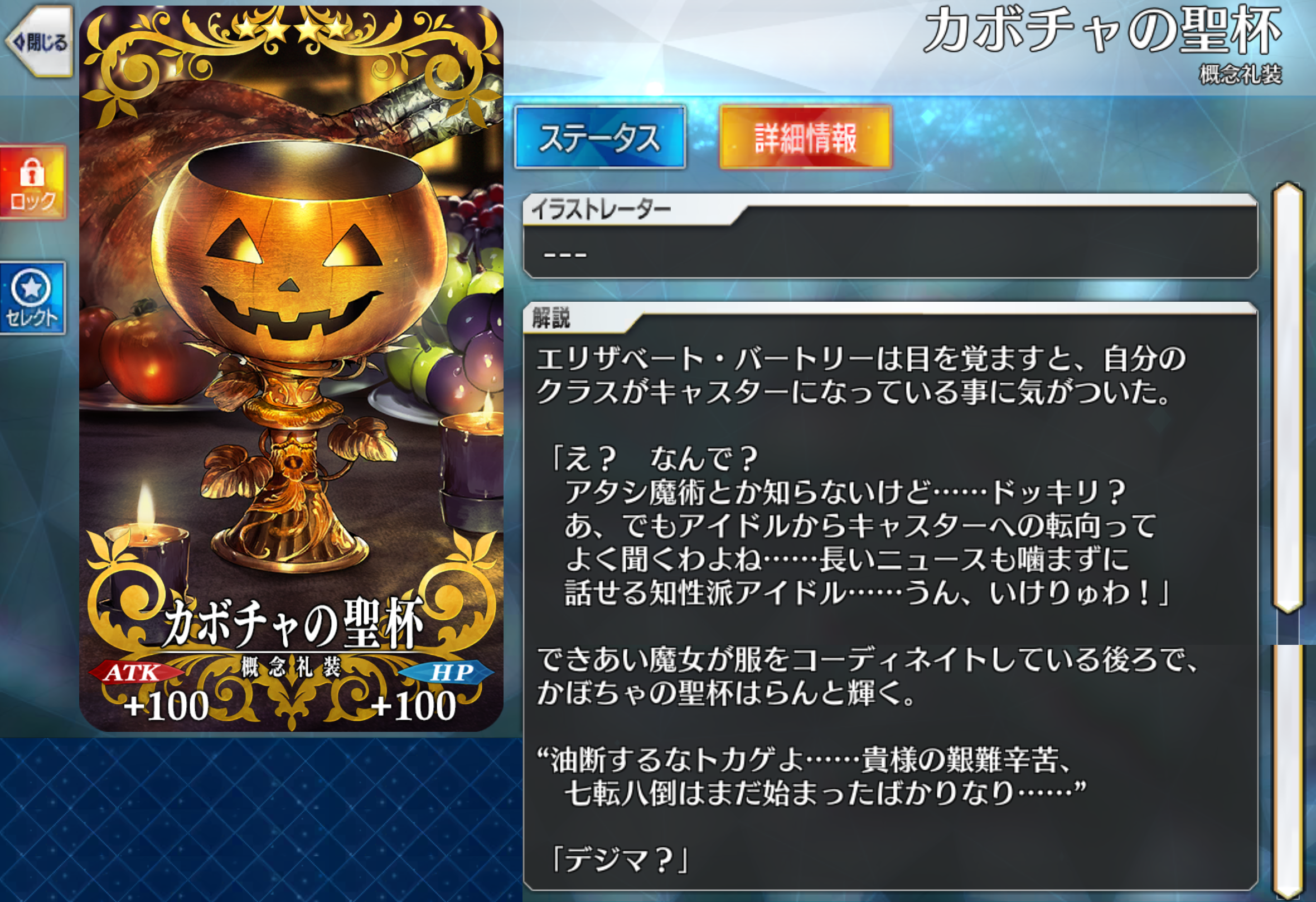 『エリザベート・バートリー〔ハロウィン〕』の絆礼装を紹介。かぼちゃの聖杯はらんと輝く。 “油断するなトカゲよ……貴様の艱難辛苦、七転八倒はまだ始まったばかりなり……” 2026年01月08日 カテゴリ:絆礼装 なんだこれ?こんなんファイナルでも出てこなかったけど。七転八倒…ハロウィン、ブレイブ、メカエリ、シンデレラ、九紋竜、終わりの…まだ六転。まさかこの時からすべてのハロウィンが定められてたとしたら…特異点Fのように最初に立ち返るのがハロウィンにもあるのだとしたら…いや、まさかな… コメントする コメントフォーム 名前 コメント 記事の評価 リセット リセット 顔 星 情報を記憶 コメントを投稿する 「絆礼装」カテゴリの最新記事