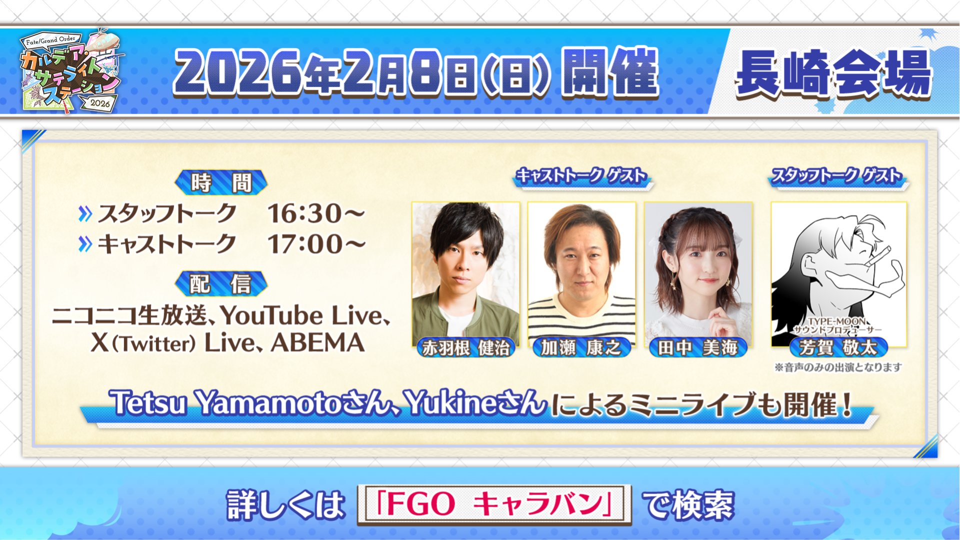 2月8日(日)16:30から「FGO カルデア・サテライトステーション 2026」長崎会場のステージを生配信いたします!
