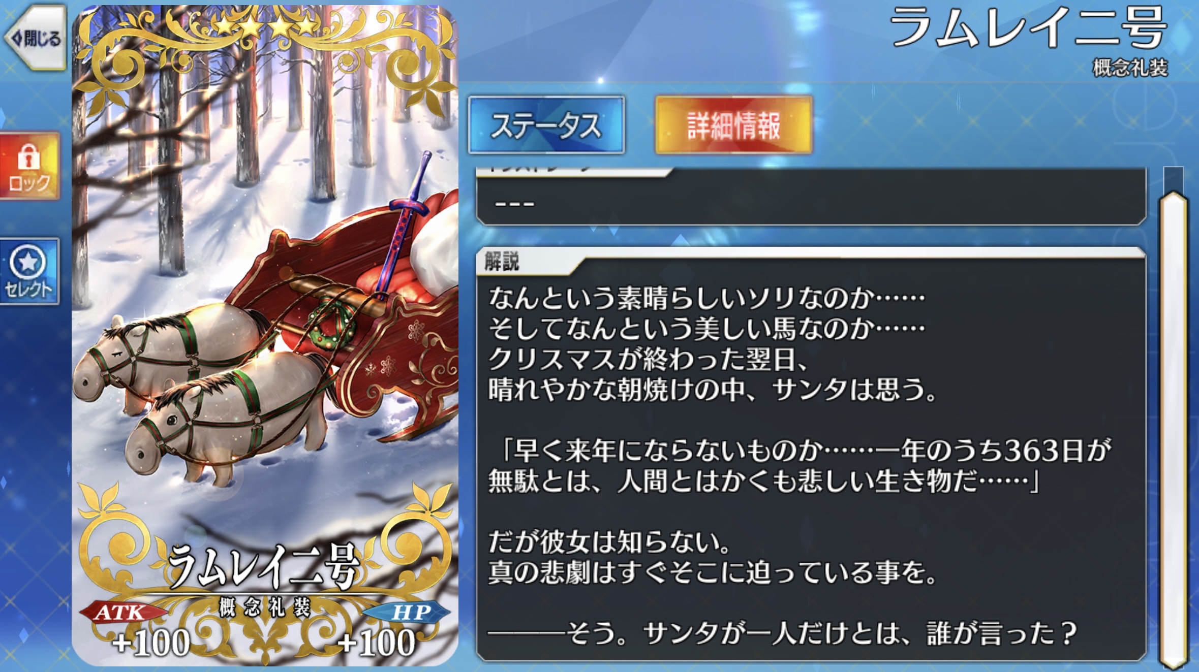 『アルトリア・ペンドラゴン〔サンタオルタ〕』の絆礼装を紹介。早く来年にならないものか……一年のうち363日が無駄とは、人間とはかくも悲しい生き物だ…… 2026年02月11日 カテゴリ:絆礼装 ついに365日無駄な年があったとさ。ラムレイ二号ぶちゃかわいいってやつだこれ。モーション改修もないですしや宝具演出にも登場しないのでここでしか見れない悲しいやつ。こんな愛らしいのに。サンタサーヴァントはついに10騎を迎えましたね。去年末は終章でなかったので逆に今年のクリスマスが盛大に特異点になってそう。クリスマスを終わらせにきた。とかいうサンタが現れるかもしれない コメントする コメントフォーム 名前 コメント 記事の評価 リセット リセット 顔 星 情報を記憶 コメントを投稿する 「絆礼装」カテゴリの最新記事