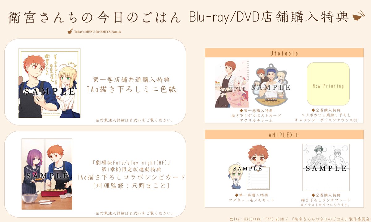 6月6日発売のBD&DVD第一巻の店舗別特典を公開いたしました!詳細はこちら→https://t.co/z4Hxvi7pm0#衛宮ごはん pic.twitter.com/co2nm7zFF7