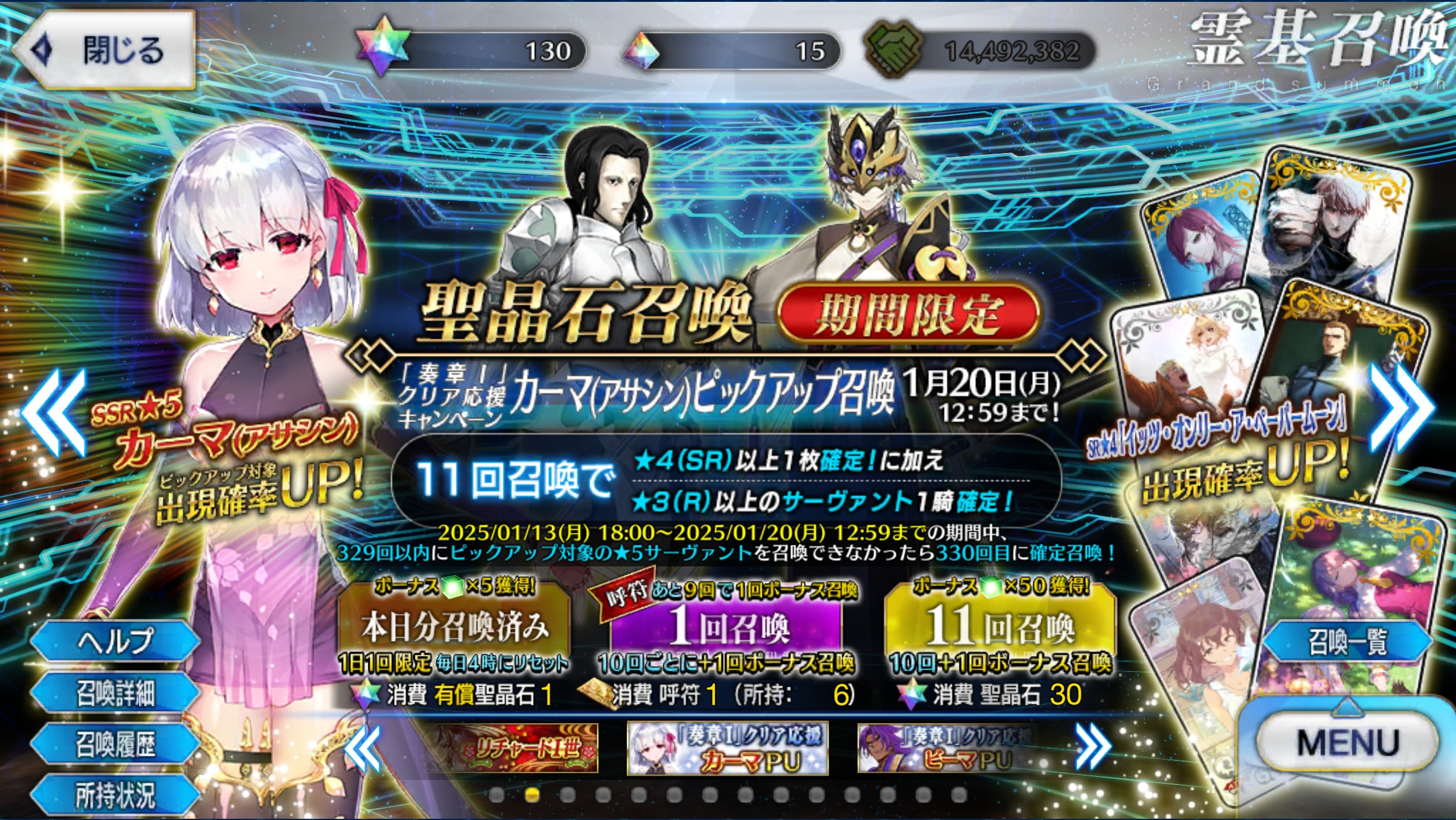 『「奏章Ⅰ」クリア応援キャンペーン カーマ(アサシン)ピックアップ召喚』!何度目になるか分からないカーマちゃんガチャ…少ない石ですがお願いしますお迎えさせてください… 2025年01月14日 カテゴリ:ガチャ 続きを読む
