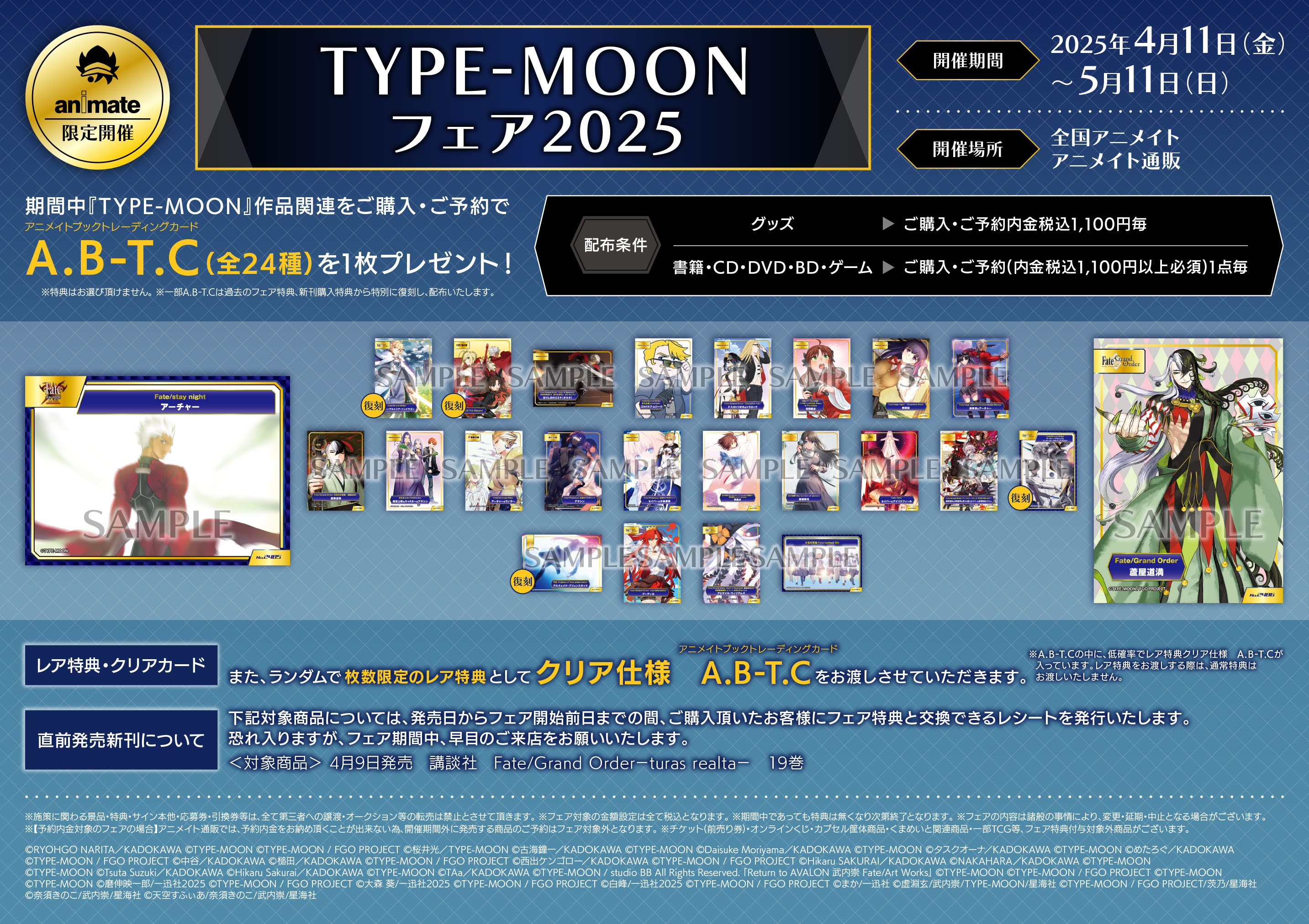 アニメイトにて4月11日より「TYPE-MOONフェア2025」開催。『TYPE-MOON』関連商品をご購入・ご予約(1,100円(税込)以上必須)1点毎に1枚、A.B-T.C(全24種)をランダムで配布! 2025年04月04日 カテゴリ:書籍情報 続きを読む