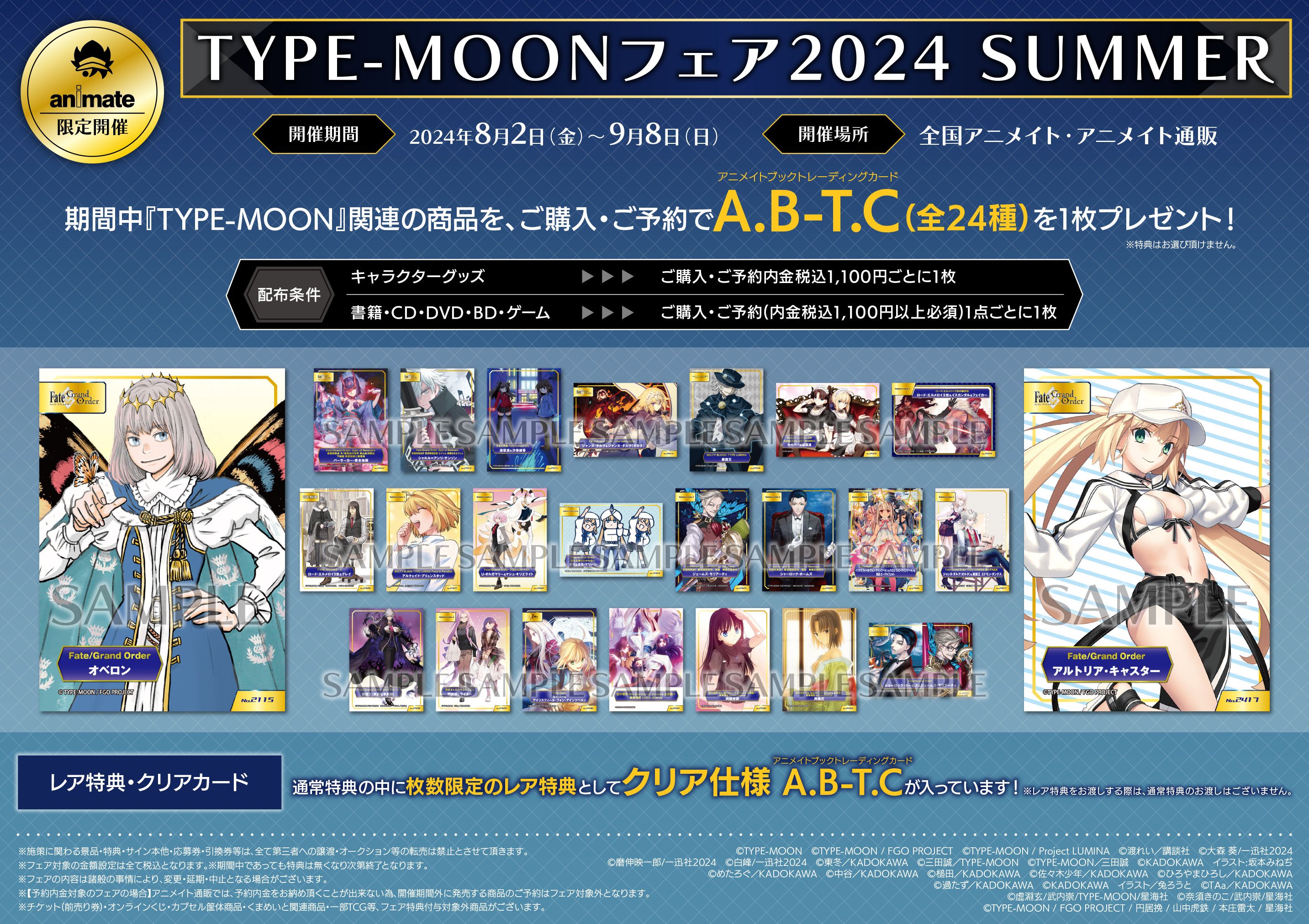 アニメイトにて8月2日より「TYPE-MOONフェア2024 SUMMER」開催。『TYPE-MOON』関連商品をご購入・ご予約(1,100円(税込)以上必須)1点毎に1枚、A.B-T.C(全24種)をランダムで配布! 2024年07月21日 カテゴリ:書籍情報 続きを読む