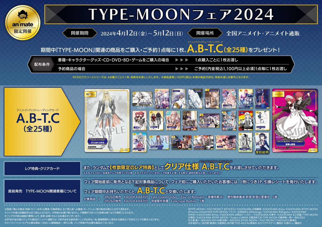アニメイトにて4月12日より「TYPE-MOONフェア2024」開催。『TYPE-MOON』関連商品をご購入・ご予約(1,100円(税込)以上必須)1点毎に1枚、A.B-T.C(全25種)をランダムで配布! 2024年03月24日 カテゴリ:書籍情報 続きを読む