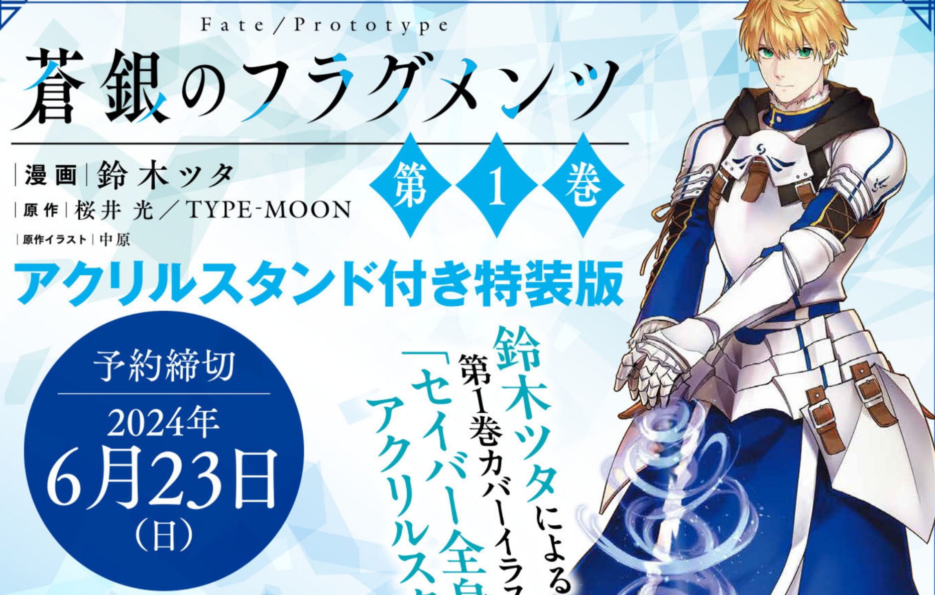 「Fate/Prototype蒼銀のフラグメンツ」第1巻の発売日が9月25日に決定! 鈴木ツタ先生による「セイバー全身アクリルスタンド」が付いた特装版が予約受付開始! 2024年05月24日 カテゴリ:書籍情報Fate/Prototype 続きを読む