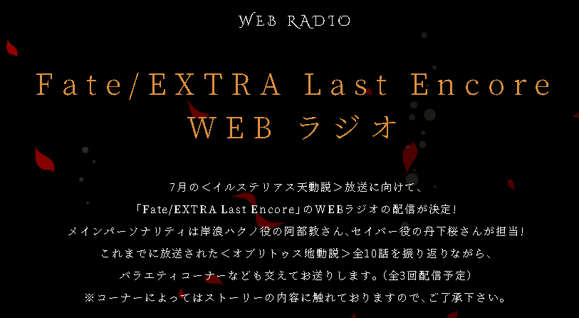 7月放送の『Fate/EXTRA Last Encore<イルステリアス天動説>』を向けて、阿部敦さん、丹下桜さんがパーソナリティのWEBラジオが配信決定 2018年06月03日 カテゴリ:Fate/EXTRA 続きを読む