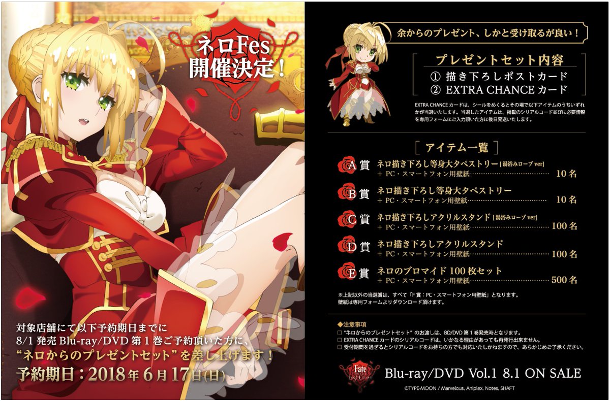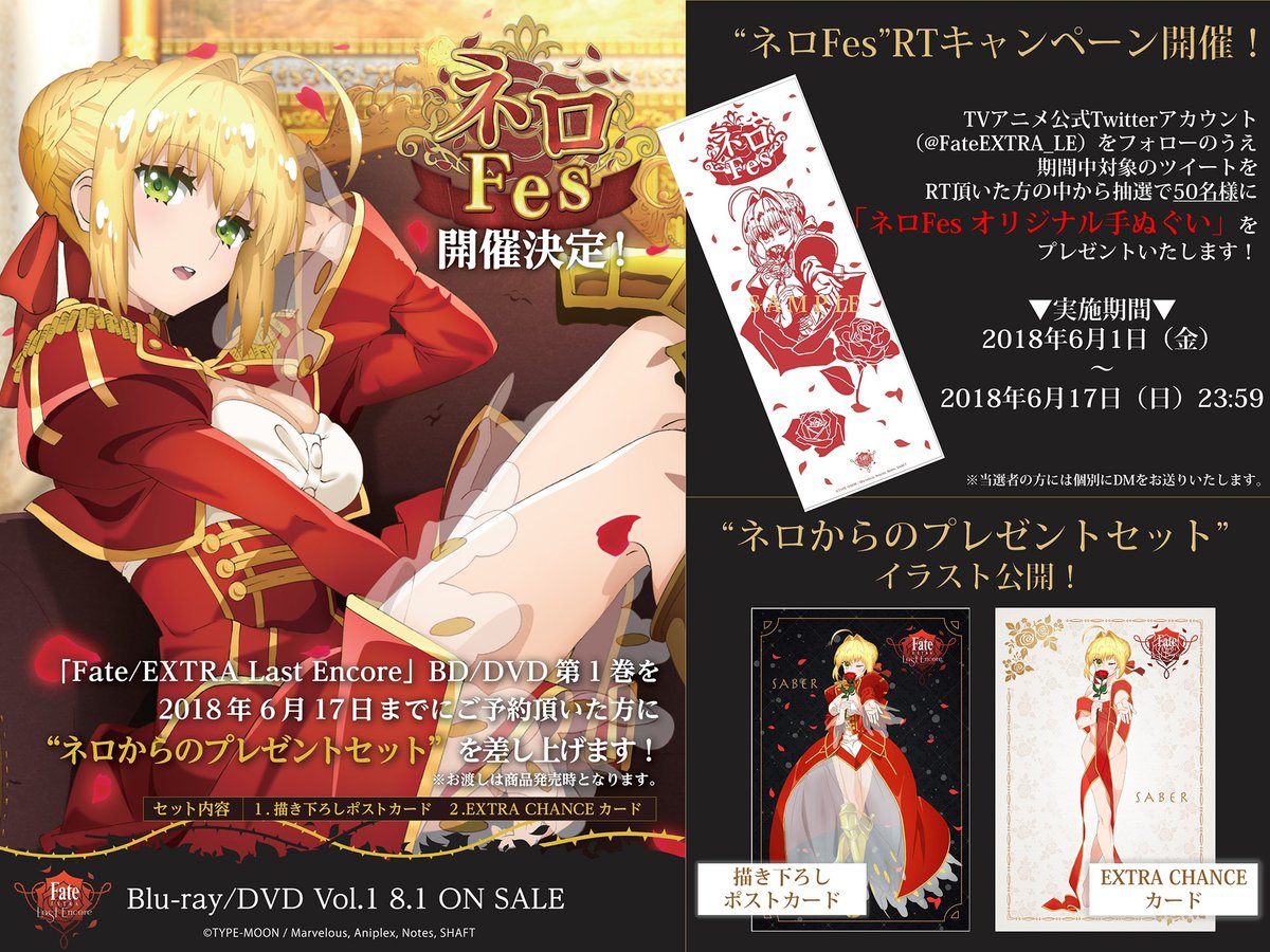 「Fate/EXTRA Last Encore」 BD&DVDの発売を記念して「ネロFes」の開催決定!期日までにご予約頂いた方に"ネロのプレゼントセット"をプレゼント 2018年04月03日 カテゴリ:Fate/EXTRA 続きを読む