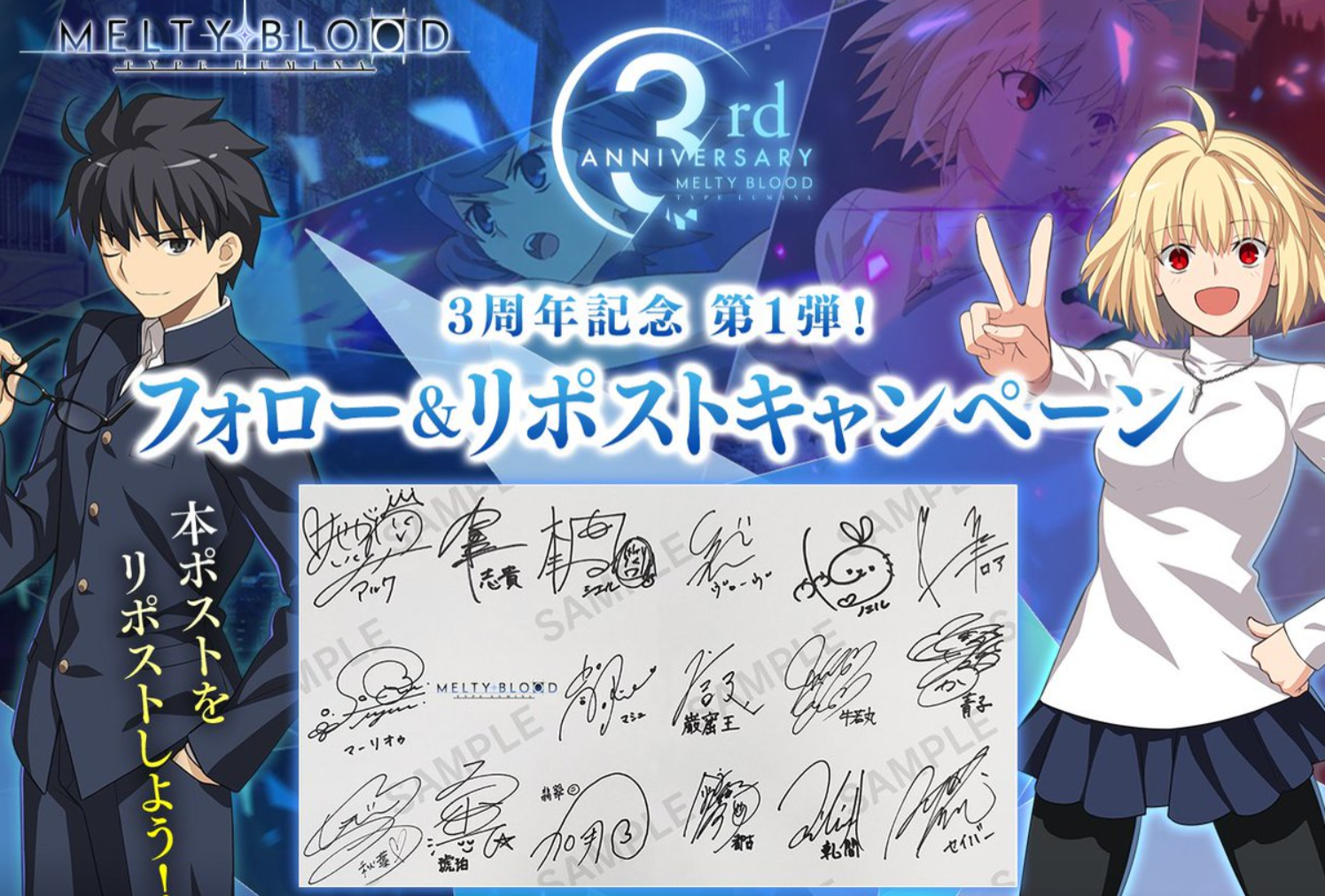 『MELTY BLOOD: TYPE LUMINA』3周年を記念して出演声優のサイン色紙やオリジナルグッズが抽選で1名様に当たるキャンペーンが第1弾から第5弾まで開催! 2024年09月30日 カテゴリ:月姫・MeltyBlood 続きを読む