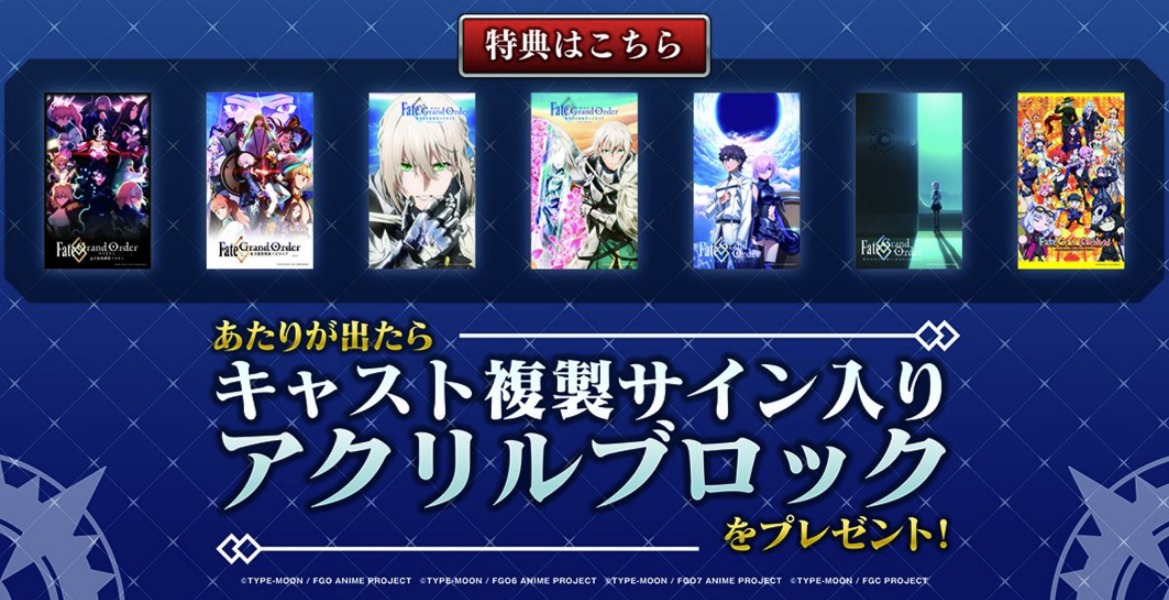 「Fate/Grand Order」アニメプロジェクト 第一部完結記念BD/DVD購入キャンペーンが開催!「キャスト複製サイン入りアクリルブロック」が当たるスクラッチカードをプレゼント! 2021年12月11日 カテゴリ:冠位時間神殿ソロモン劇場版 Fate/Grand Order -神聖円卓領域キャメロット- 続きを読む