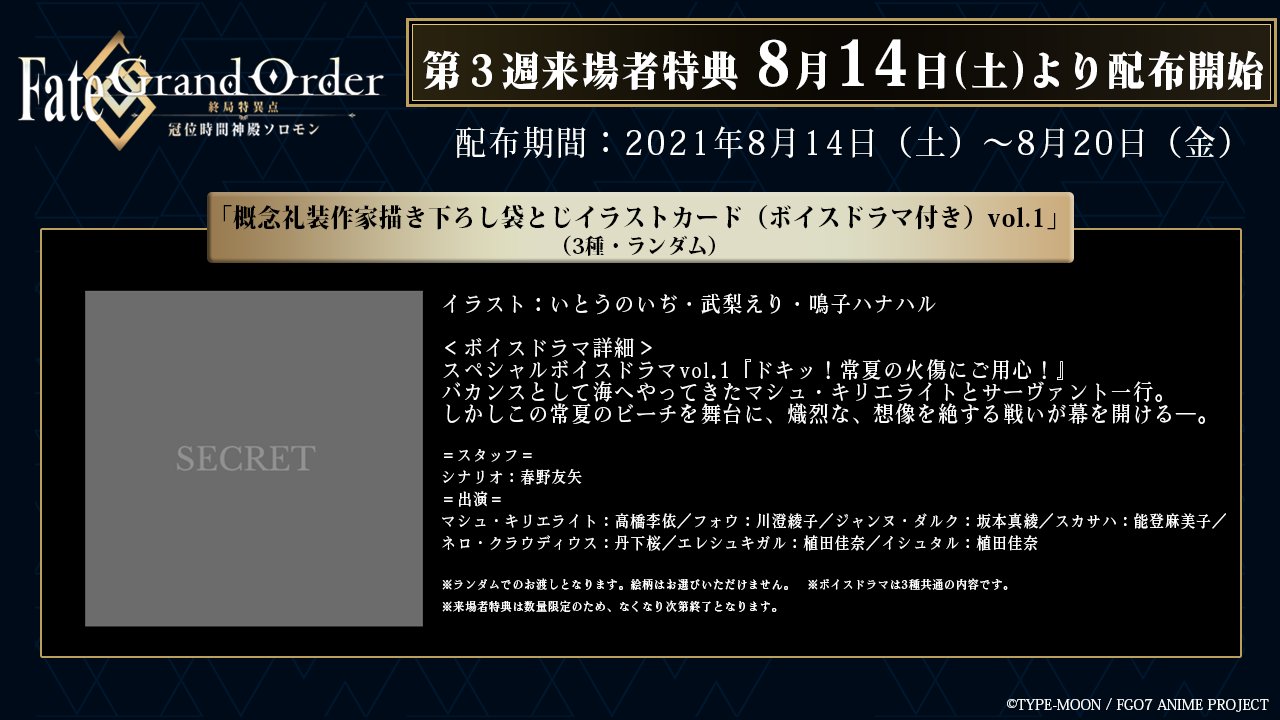『FGO終局特異点 冠位時間神殿ソロモン』 第3週来場者特典は「概念礼装作家描き下ろし袋とじイラストカード(ボイスドラマ付き)vol.1(3種ランダム)」に決定!特典の紹介映像も公開 2021年08月10日 カテゴリ:冠位時間神殿ソロモン 続きを読む