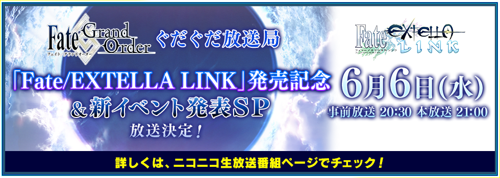ニコニコ生放送配信特別番組 『Fate/Grand Order ぐだぐだ放送局 「Fate/EXTELLA LINK」発売記念&新イベント発表SP』放送決定! 2018年05月29日 カテゴリ:Fate/Grand Order 続きを読む