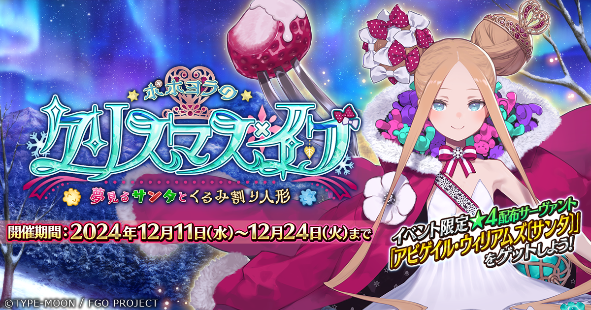 「ポホヨラのクリスマス・イブ 夢見るサンタとくるみ割り人形」開演!今年のサンタサーヴァント「★4(SR)アビゲイル・ウィリアムズ〔サンタ〕」が登場! 2024年12月11日 カテゴリ:FGOイベント幕間の物語・強化クエスト 続きを読む